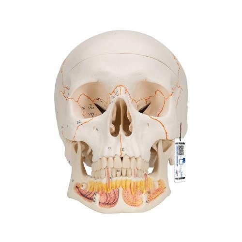 This dental skull with opened mandible exposes tooth roots with vessels and nerves. The skull model also features the numbering of the cranial bones, bone components, fissures, foramina and other structures. The cranial sutures are shown in color, as are the meningeal vessels and venous sinuses. This skull is a great tool for dental students and teachers alike.