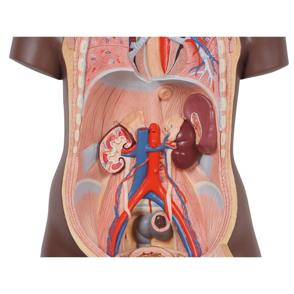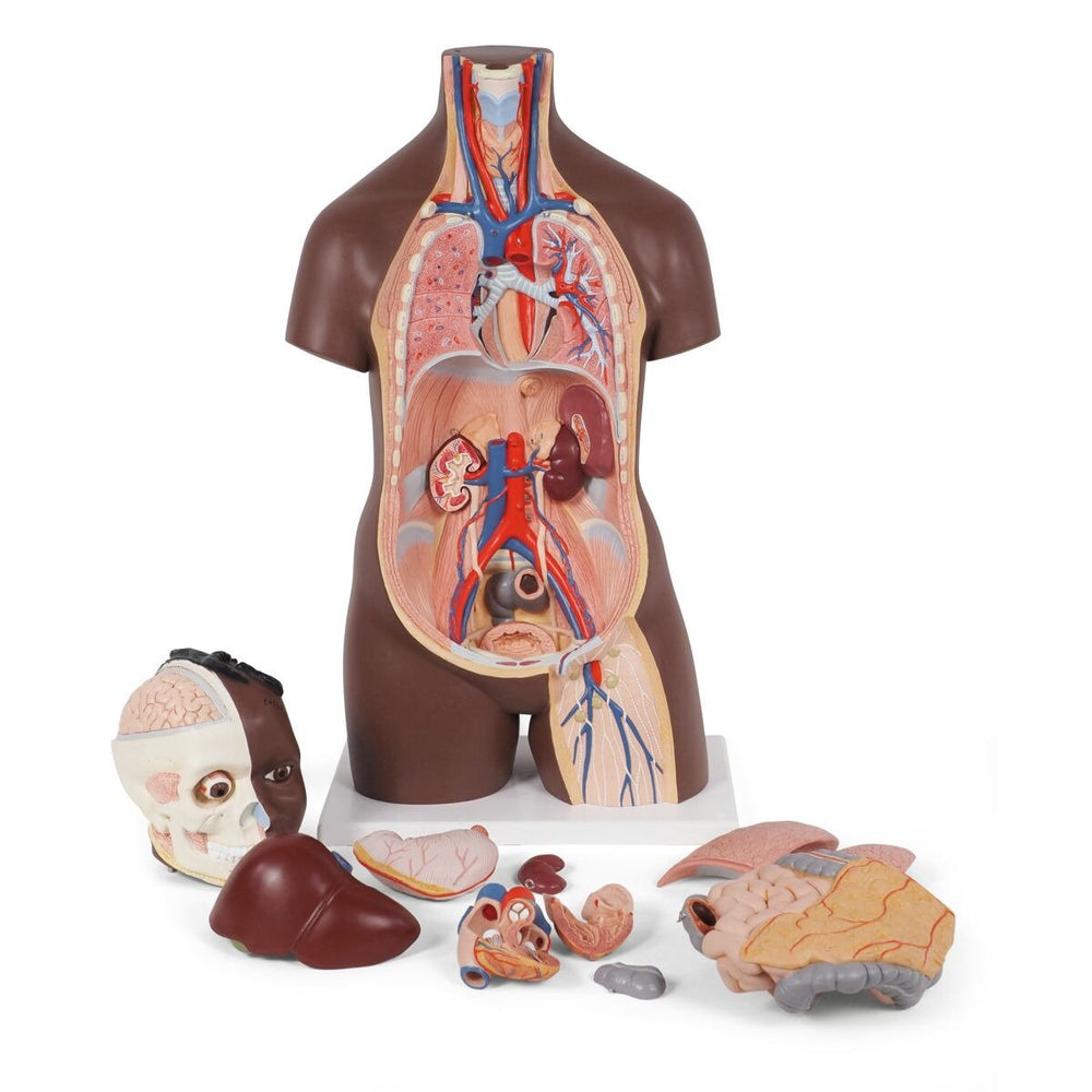 This 12 part anatomically correct human torso is an educational tool of true quality. The genderless torso is hand-painted true to detail and made of high-quality plastic. This classic human torso was developed and modeled in Germany. Whether you are a student studying human anatomy in a biology classroom or a doctor explaining something to a patient, this human torso model is a valuable tool.The following components of this genderless torso are removable: