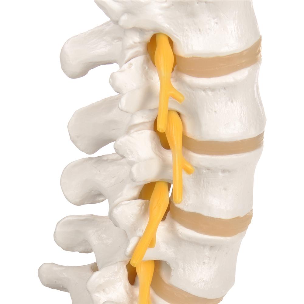 The human lumbar spinal column Consists of the 5 lumbar vertebrae with intervertebral discs, sacrum with flap, coccyx, spinal nerves and dura mater of spinal cord. This high quality spinal replica has accurate anatomical detail for use in any anatomy classroom. The lumbar spinal column is delivered on a removable high quality stand.GTSimulators by Global Technologies