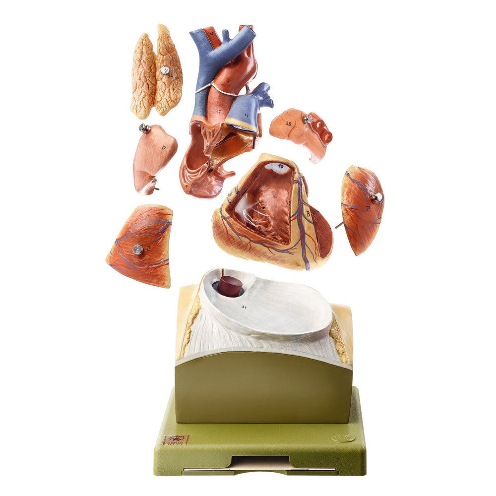 Natural size, made in SOMSO-Plast®. Model separates into 8 parts as follows: diaphragm with section of pericardium, thymus gland, apex of the heart, lower part of the ventricles, ventricles, 4 valves open to show the right and left atria and right and left ventricles. The proportions of the pericardium are to be seen at the corresponding intersecting lines, the plane of the valve with semilunar and sigmoid valves and the passage of the coronary vessels can be shown in their connection. On a green base. Height: 29 cm., width: 18 cm., depth: 19 cm., weight: 1.3 kgCleaning and disinfecting your SOMSO Model:Spray a rapid and effective water based disinfectant for use on surfaces and wipe with a soft cloth.