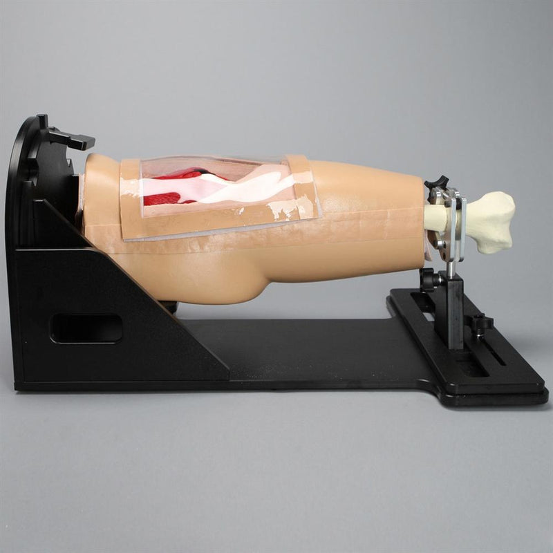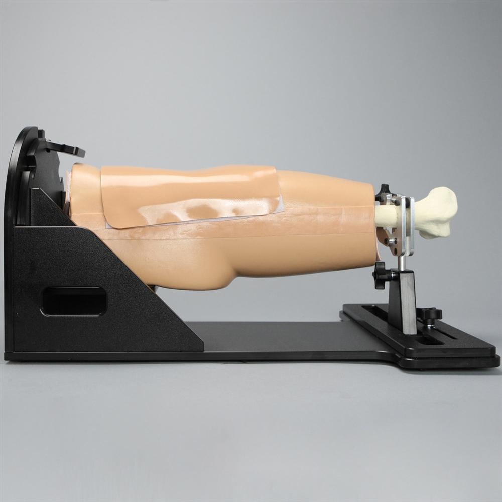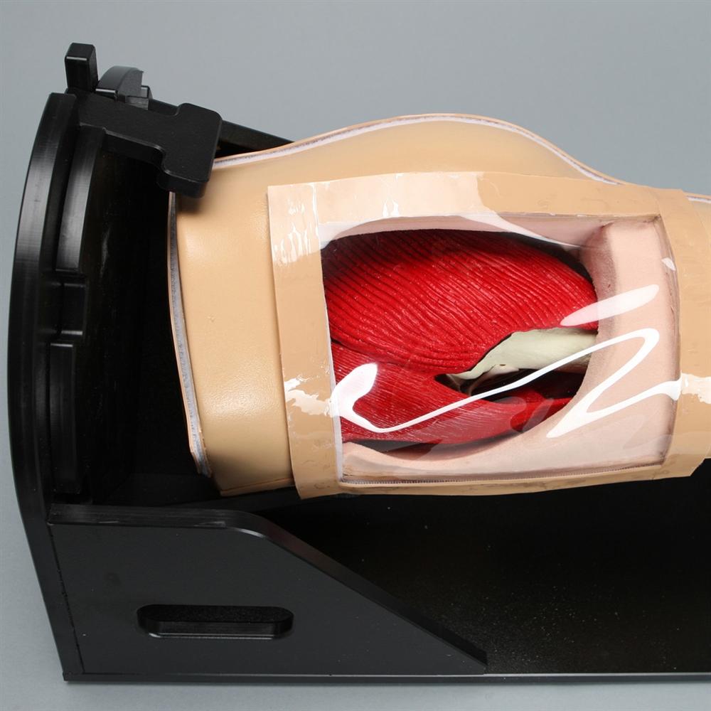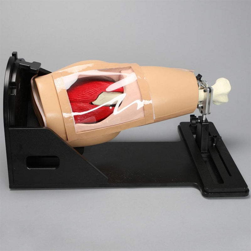 Replaceable insert includes the major muscles of the hip, labrum with tears and articular cartilage with erosion. Mounted on deluxe stand for full rotation between anterior and lateral positions. Also allows user hands-free distraction and rotation on the femur for added joint accessibility. Replaceable skin patches include velcro attachments.