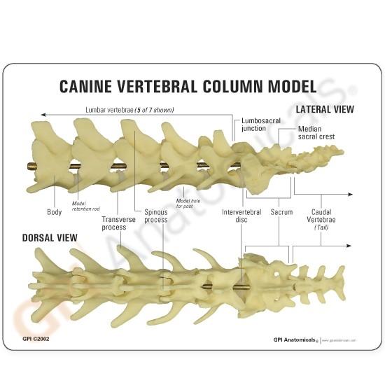 Canine vertebral column model of average size features five lumbar vertebrae and discs, caudal (tail) vertebrae and sacrum.