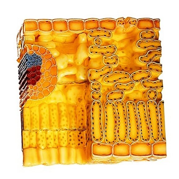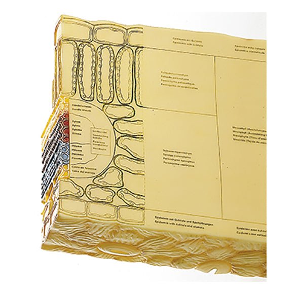 Enlarged 700 times, made in SOMSO-Plast®. After Prof. Dr. W. Weber. The model shows the upper epidermis with cuticula, the assimilation network (separated into pallisade and parenchymatous cells with cytoplasmic lining) and the lower epidermis with stomates. Model in one piece, on a stand with green base and explanatory key.