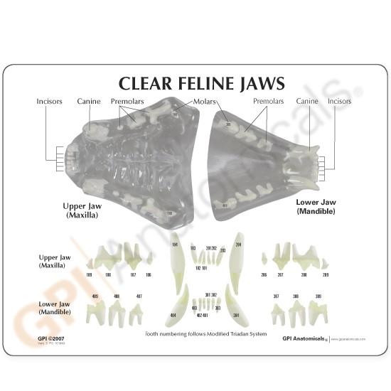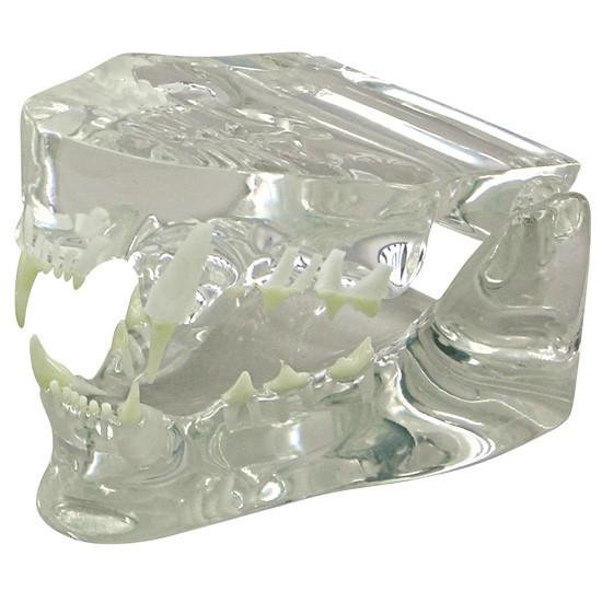 Clear hinged feline jaw model showing the roots of all teeth (incisors, canine, premolars, molars). Jaws open, close and separate for closer study.