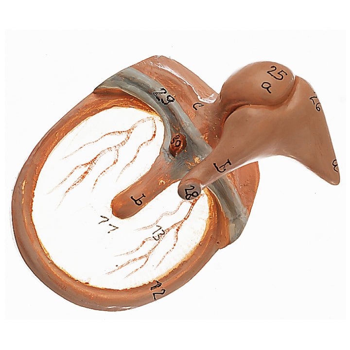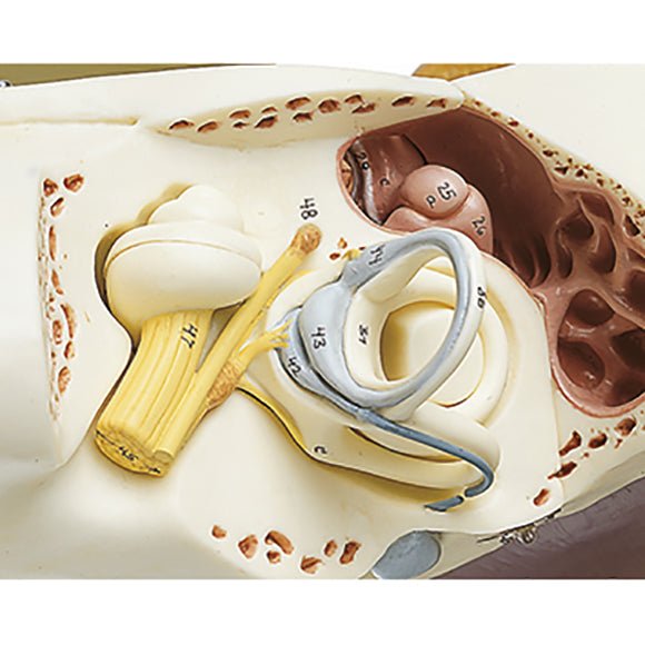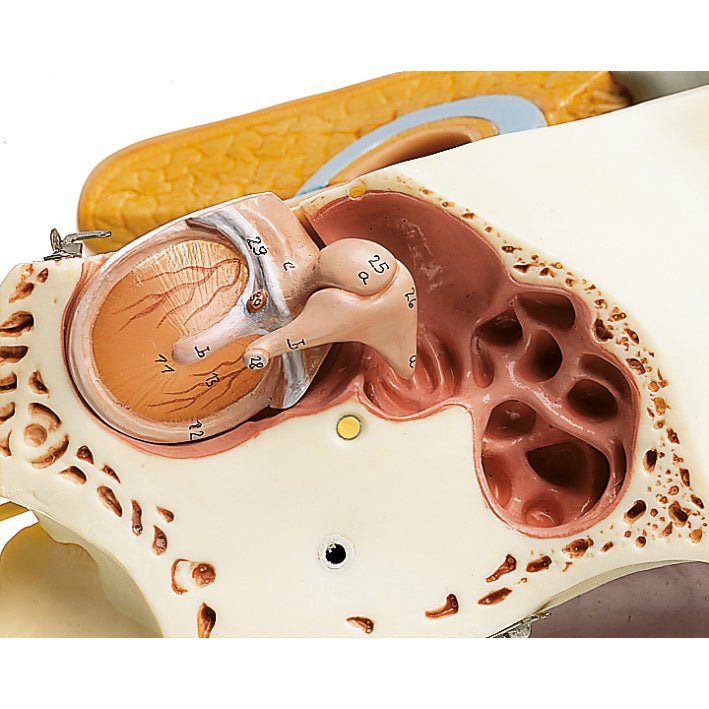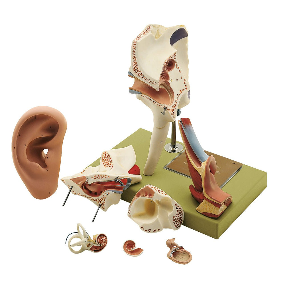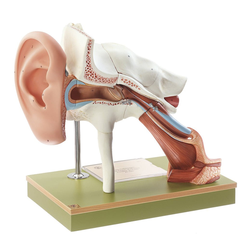 Enlarged approx. 4 times enlarged, made in SOMSO-Plast®. Model separates into pinna, petros portion of temporal bone (3), tympanic membrane, labyrinth (2), Eustachian tube. Altogether 8 parts. On a stand with green base. Height: 41 cm., width: 44 cm., depth: 26 cm., weight: 3.7 kgCleaning and disinfecting your SOMSO Model:Spray a rapid and effective water based disinfectant for use on surfaces and wipe with a soft cloth.