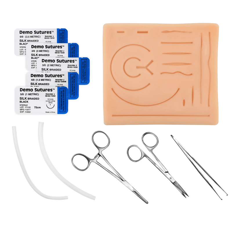 - Kit includes 5" needle holder, toothed forceps, suturing scissors, 3 suture varieties with needles and tubing pieces to practice securing tubes, drains and catheters