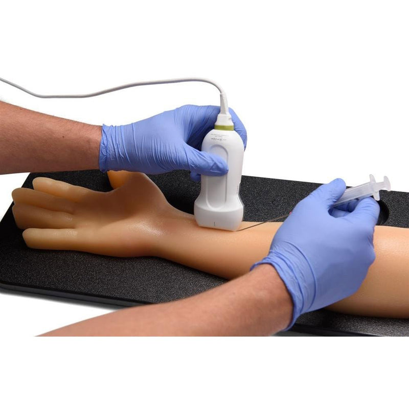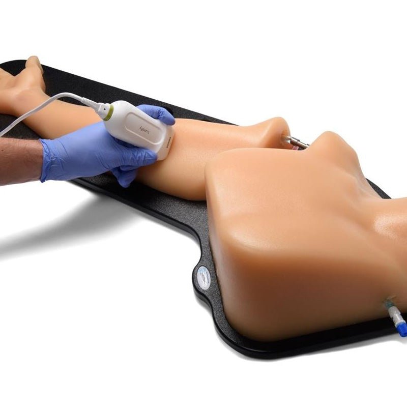 We designed this CAE Blue Phantom arm and chest model entirely of our patented Simulex tissue to practice the skills associated with ultrasound-guided vascular access procedures of the upper extremity. This model is ideal for practicing peripherally inserted central catheter (PICC) line placement, and arterial and peripheral intravenous (IV) line placement. Learners can practice navigating ultrasound system controls, positioning and moving transducers, using ultrasound to identify vascular anatomy, and targeting vessels for cannulation. The Simulex tissue has self-healing properties, allowing for 1000+ punctures when used with an 18-21 gauge needle.Includes: