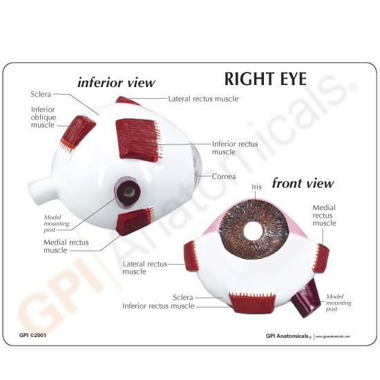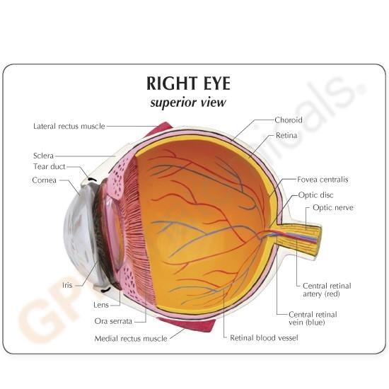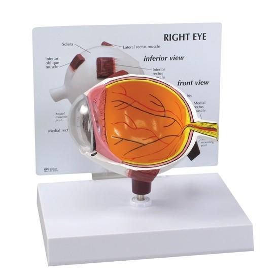 Oversized normal eye model with cut-away to show inner anatomy, including optic nerve, disc, macula, retina, central retinal artery and vein. Lens and cornea are removable.