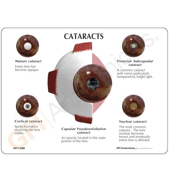 Oversized normal eye model with cut-away to show inner anatomy. Includes five interchangeable lenses that show various types of cataract conditions including: subcapsular, capsular, mature, cortical and nuclear. Lens and cornea are removable.