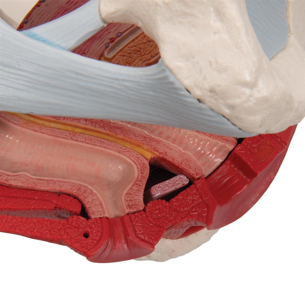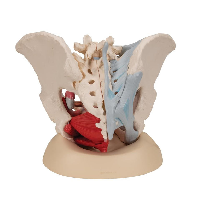 This life size four part model of a female pelvis represents detailed information about the topography of bones, ligaments, pelvic floor muscles and female pelvic organs. The right half shows the bones with pelvic ligaments. In addition, the left half of the pelvis contains the muscles of the pelvic floor including levator ani, ischiocavernosus, deep and superficial transverse perineal, external anal sphincter, external urethral sphincter.