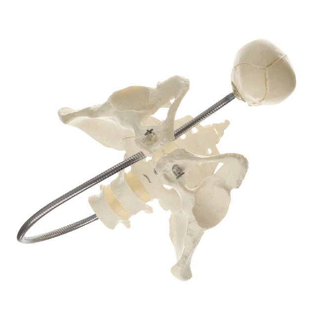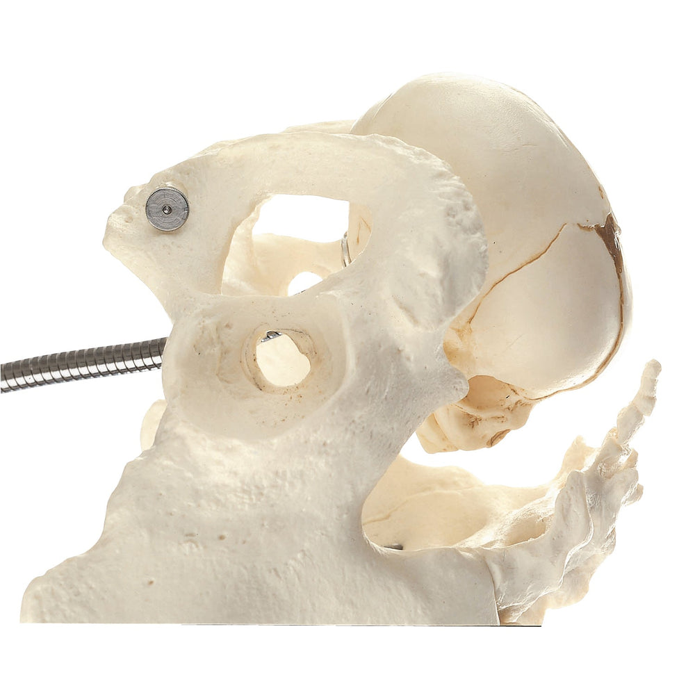 Functional Obstetric Phantom in natural size, made in SOMSO-Plast®. Consisting of the female pelvic bones (mounted and movable) and a fetal skull (size of the head 29,8 cm) attached by a piable metal cord. On a stand with green base.Cleaning and disinfecting your SOMSO Model:Spray a rapid and effective water based disinfectant for use on surfaces and wipe with a soft cloth.