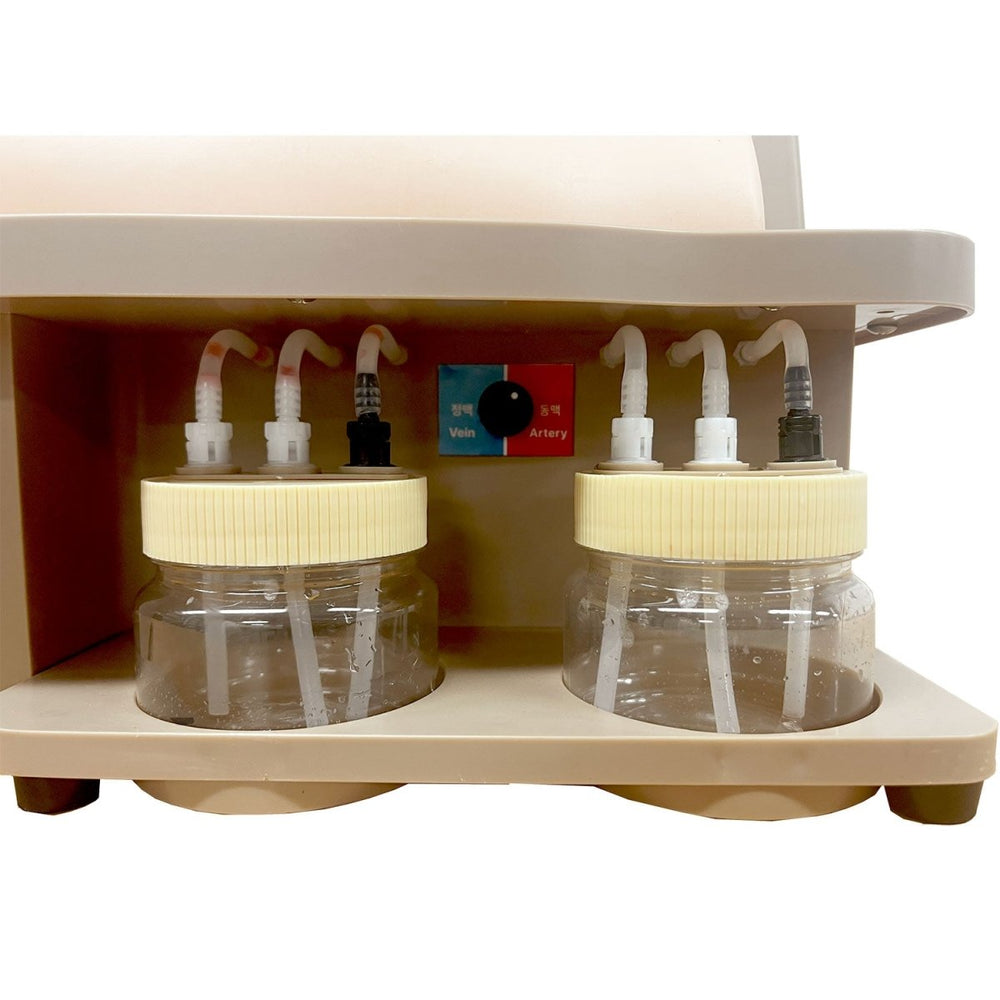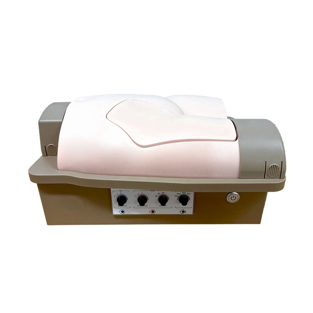 This advanced simulator offers realistic, hands-on training for femoral arterial blood sampling and venous access. It features an integrated pump system that simulates circulation with palpable, adjustable arterial pulsation and realistic flashback response during puncture.