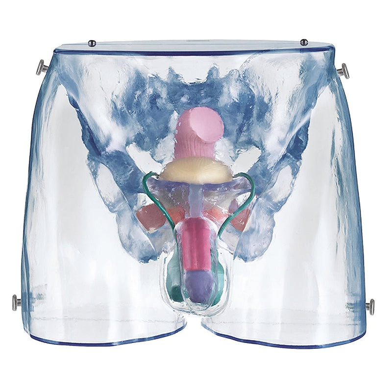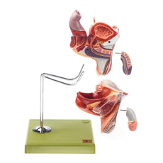 Natural size, made in SOMSO-Plast®. Developed in co-operation with Oberstudienrätin Angelika Beck. Model of the male sexual organs based on current research which makes new aspects clear - both in relation to male sexuality and sexual relationships. The organs predominantly involved in reproduction are colored green, i.e. the testicles, epididymis, urethra and seminal duct, seminal vesicle, ampulla and the Cowpers glands. Organs not predominantly involved in reproduction are coloured yellow, orange, pink and blue, i.e. the bladder, prostate gland, glans and the muscles of the cavernous bodies pertinent to an erection and the urethra. The intestines and the muscles of the pelvic floor have been coloured delicate pink. Height: 27 cm., width: 36 cm., depth: 24 cm., weight: 2.8 kg.Cleaning and disinfecting your SOMSO Model:Spray a rapid and effective water based disinfectant for use on surfaces and wipe with a soft cloth.