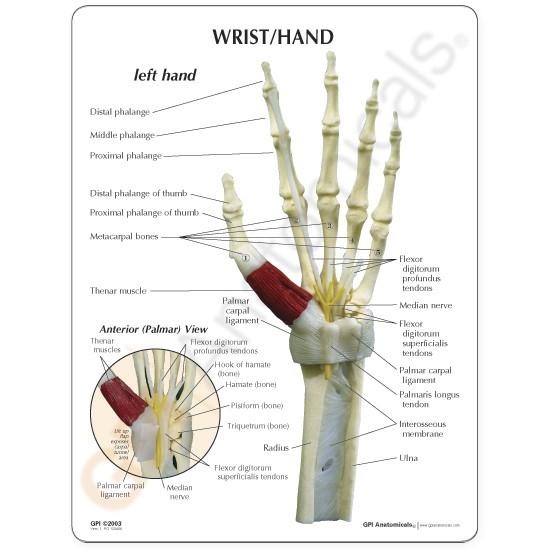 Full size solid cast of hand, wrist and forearm bones features: distal, middle and proximal phalanges, distal and proximal phalanges of the thumb, metacarpal bones, thenar muscle, palmar carpal ligament, median nerve, flexor digitorum superficialis and profundus tendons, triquetrum, pisiform, hamate, hook of hamate, palmaris longus tendon, interosseous membrane, radius and ulna.