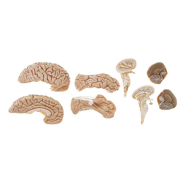SOMSO Brain Model - Natural cast - BS20Natural cast, made in SOMSO-Plast®. Model separates into 8 parts: frontal and parietal lobes (2), temporal and occipital lobes (2), medulla (2), cerebellum (2). On a base. Height: 15 cm., width: 16 cm., depth: 17 cm., weight: 1.1 kg