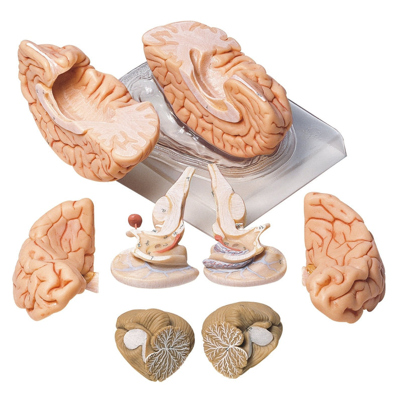 Natural cast, made in SOMSO-Plast®. Model separates into 8 parts: frontal and parietal lobes (2), temporal and occipital lobes (2), medulla (2), cerebellum (2). On a base. Height: 15 cm., width: 16 cm., depth: 17 cm., weight: 1.1 kg