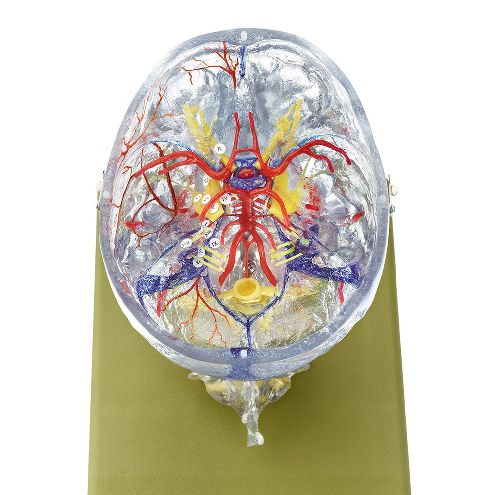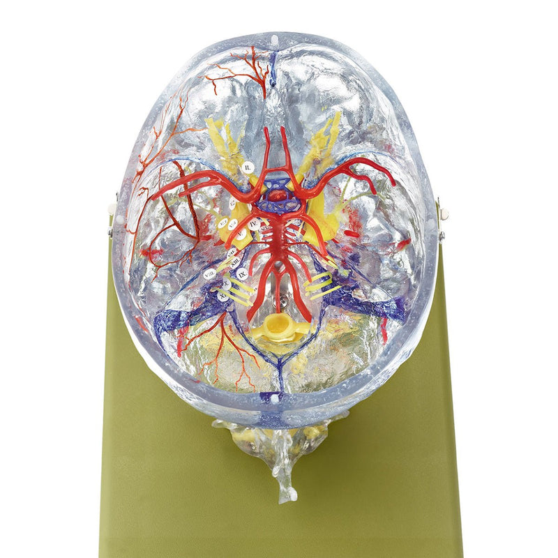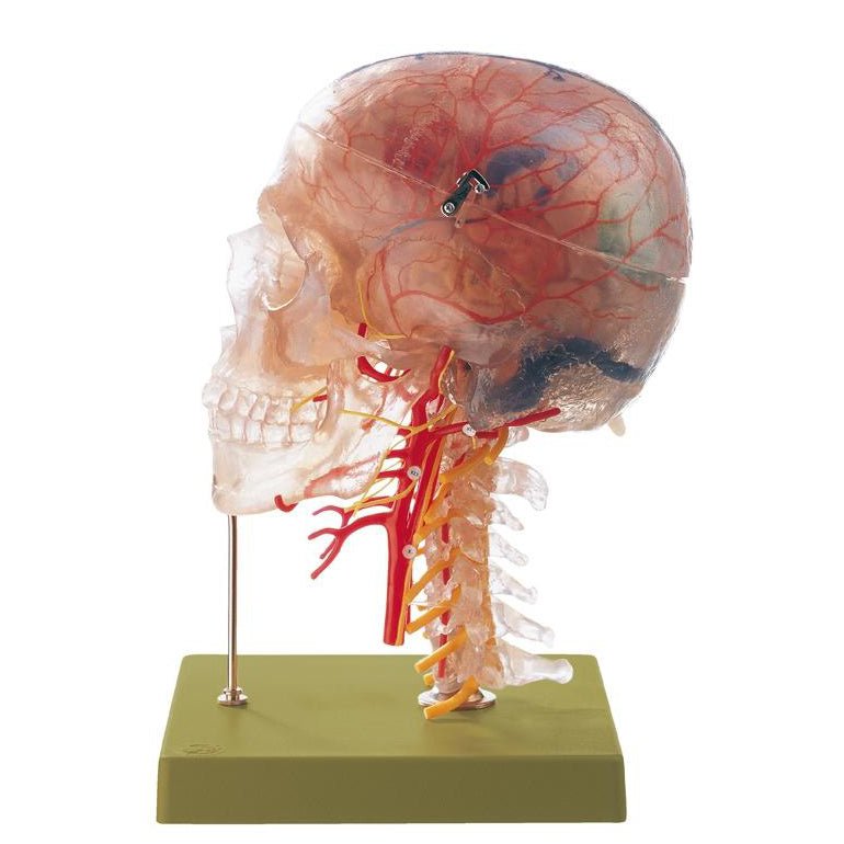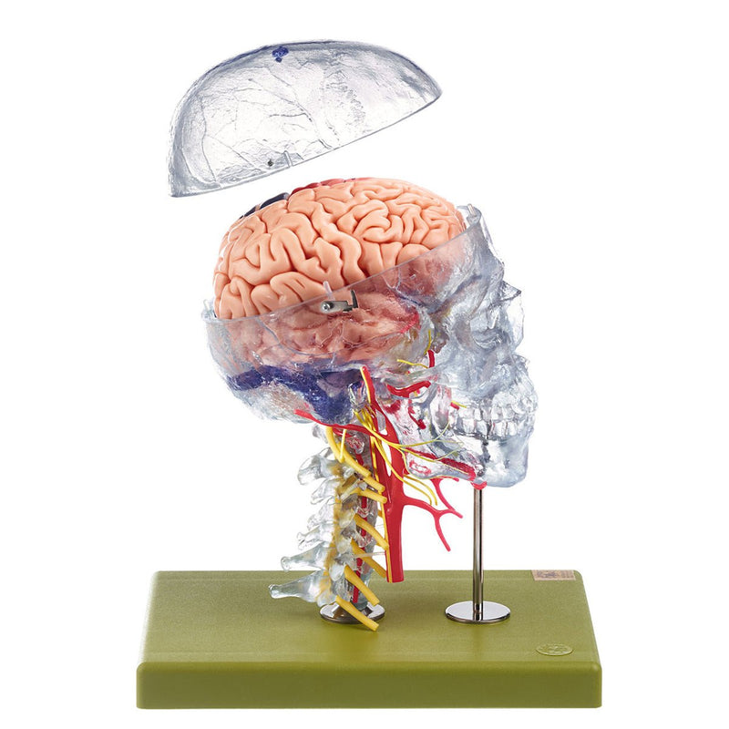 Natural cast, made of SOMSO-Plast®. Comprises a Transparent Human Skull with Cervical Vertebral Column and 8 part model of the Brain with Indicated Cytoarchitectural areas. Showing the cranial nerves and the arterial network of vessels. Model separates altogether into 10 parts. On stand with green base. Height: 29 cm., width: 18 cm., depth: 21 cm., weight. 2.2 kgCleaning and disinfecting your SOMSO Model:Spray a rapid and effective water based disinfectant for use on surfaces and wipe with a soft cloth.