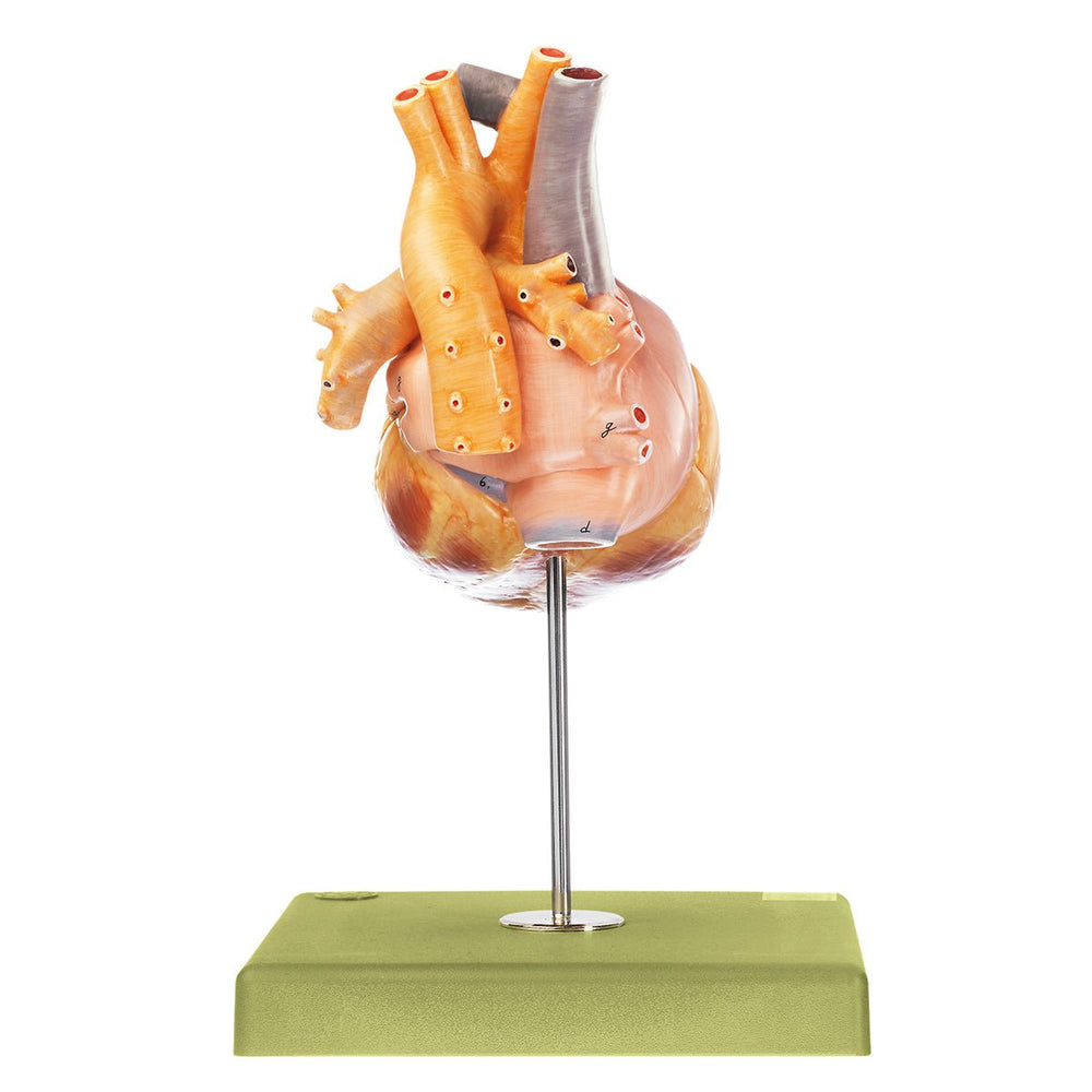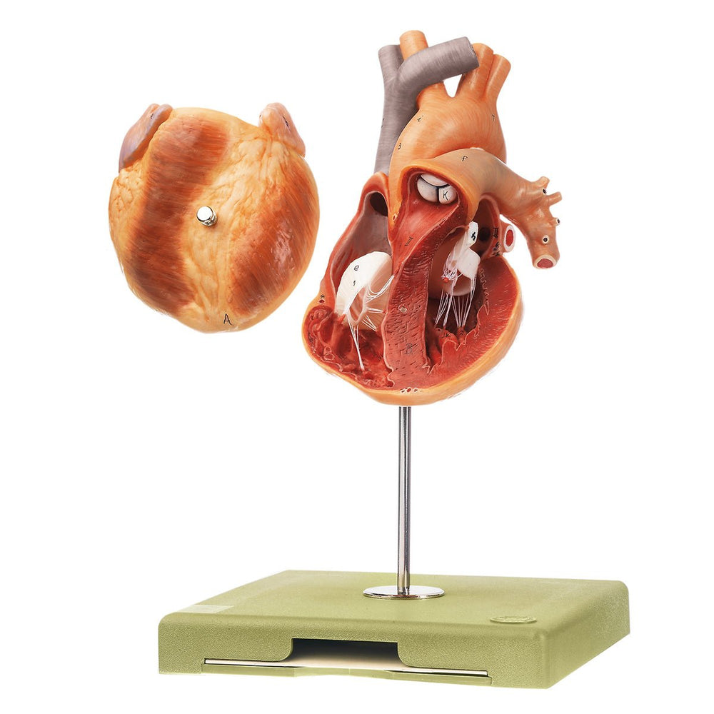 Cast from natural specimen, made in SOMSO-Plast®. An especially effective cast from a natural young heart. The inner sides of atria and ventricles are therefore prepared extremely well, above all the papillary muscles and the valves. On a stand with green base. Model separates into 2 parts. Height: 30 cm., width: 18 cm., depth: 18 cm., weight: 700 gCleaning and disinfecting your SOMSO Model:Spray a rapid and effective water based disinfectant for use on surfaces and wipe with a soft cloth.