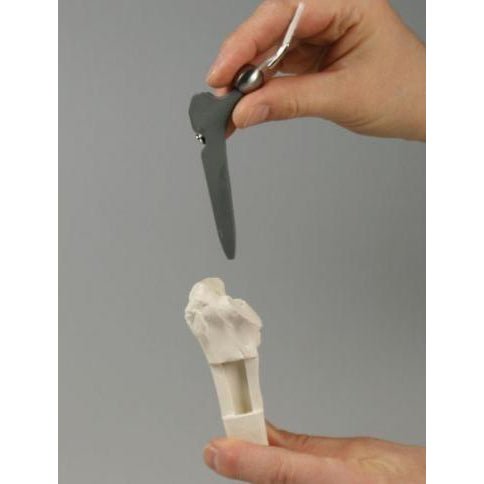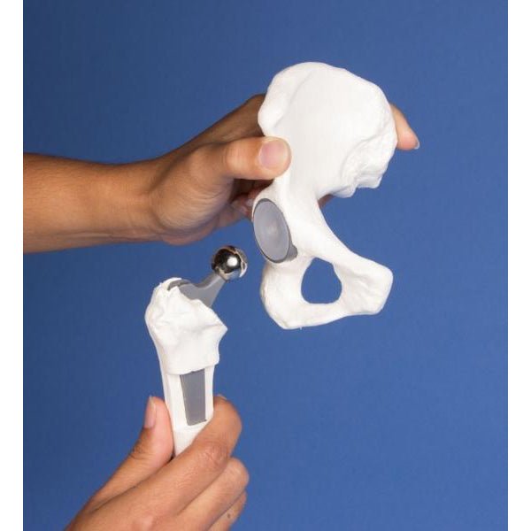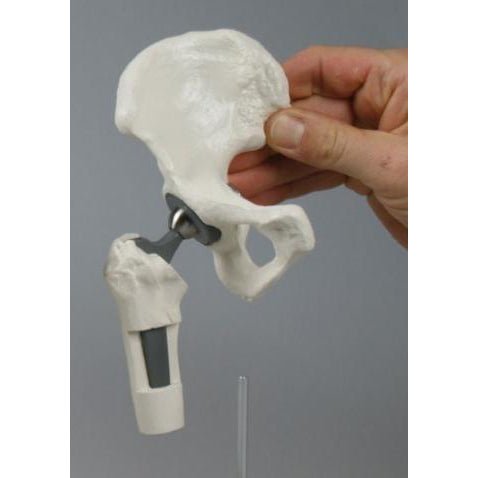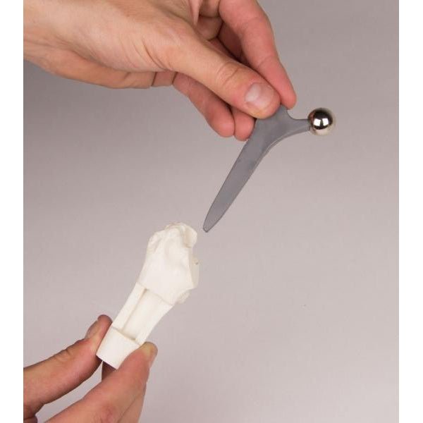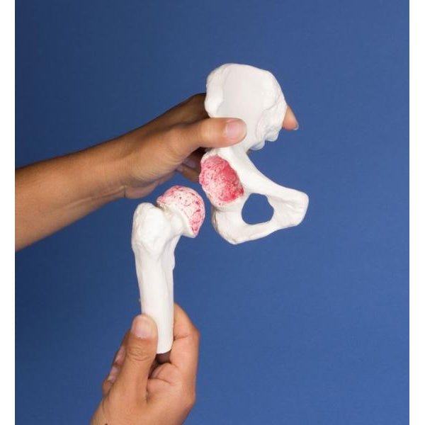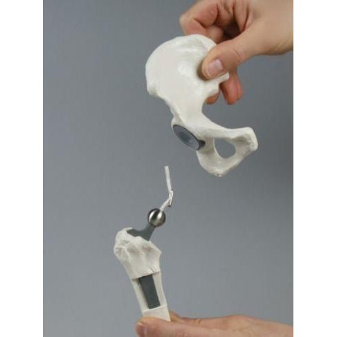 Model shows three scaled-down hip models: healthy hip, diseased hip, and knee with hip implant. All models are movable. Pelvis and femur can be separated, and the implant can be removed from the femur. Supplied on plexiglass stand. 13-3/8" x 4-3/4" x 7-1/2".