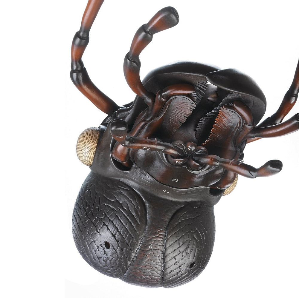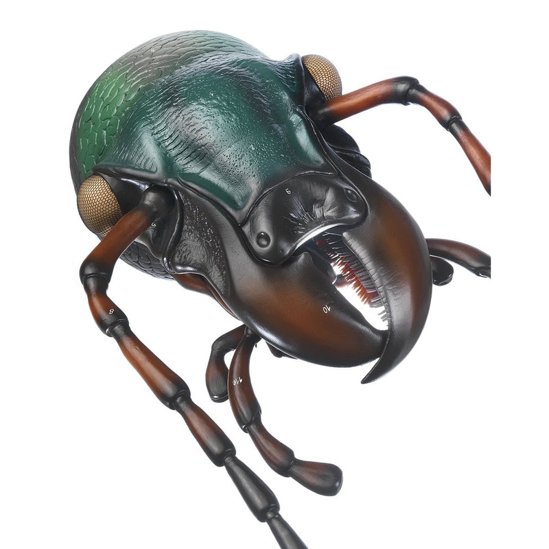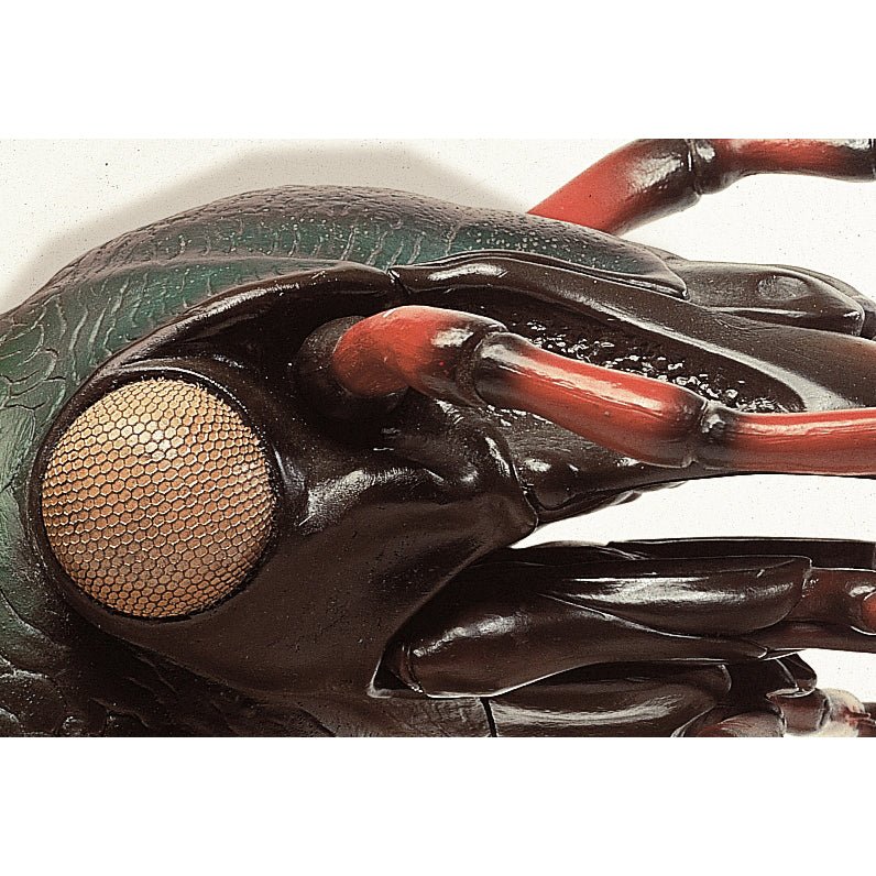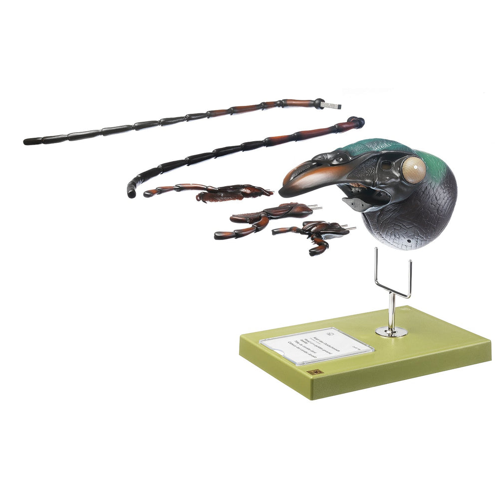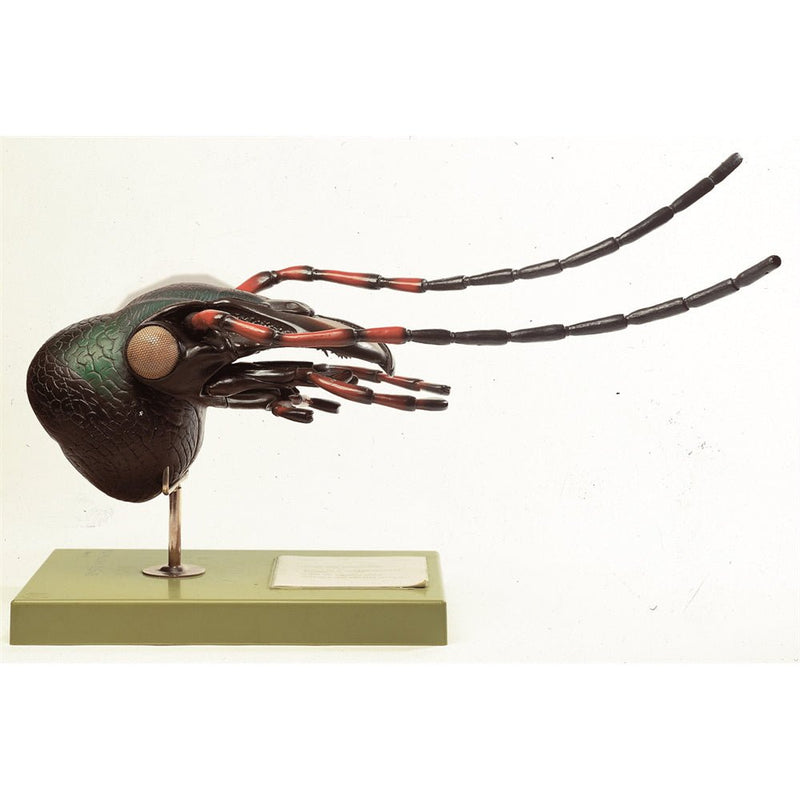 Carabus auratus, model enlarged 50 times linearly, made in SOMSO-Plast®. After Studiendirektor Christian Groß. Lower jaw, lower lip and both antennae are removable for demonstration purposes. Simplified facet structure. Model separates into 6 parts. On a green base.