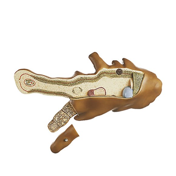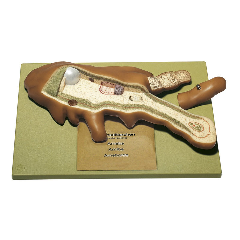 Amoeba proteus, model enlarged approx. 1000 times linearly after Prof. Dr. M. Lindauer and Studiendirektor Christian Grob. In SOMSO-Plast®. In a small pseudo-podium which can be opened up showing the structure after electronmicroscopic magnification. Adapted to the most modern standards of research. On a green base with explanatory notes. Model separates into 2 parts.Weight and Dimensions: