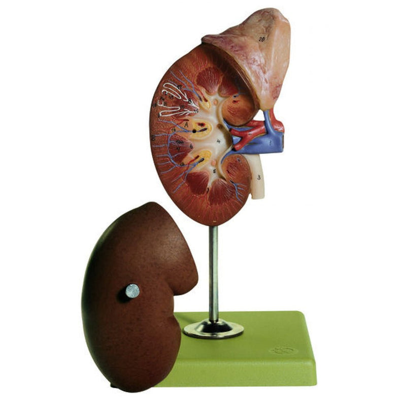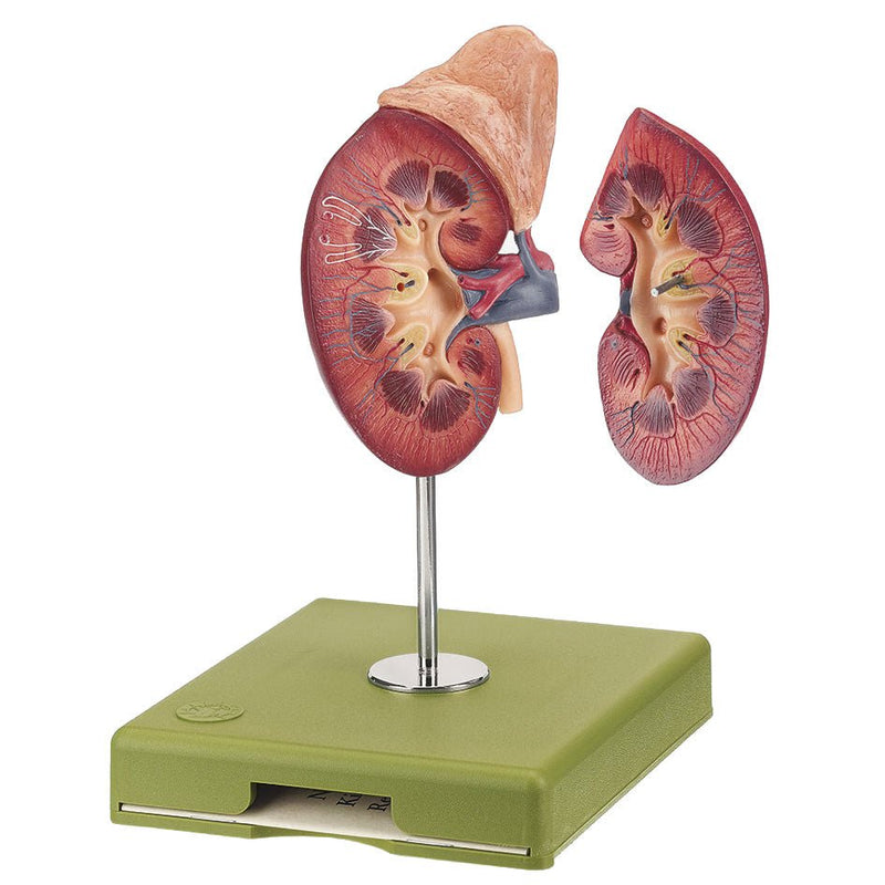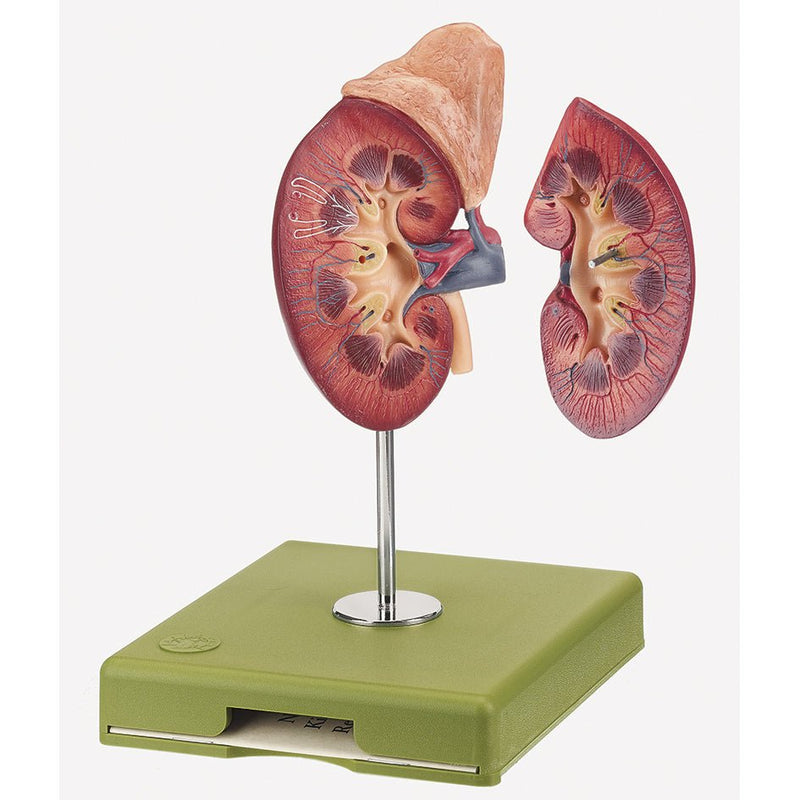 Natural size, made in SOMSO-Plast®. The kidney separates into 2 halves, longitudinal section. On a stand with green base. Height: 26 cm., width: 12 cm., depth: 12 cm., weight: 400 g