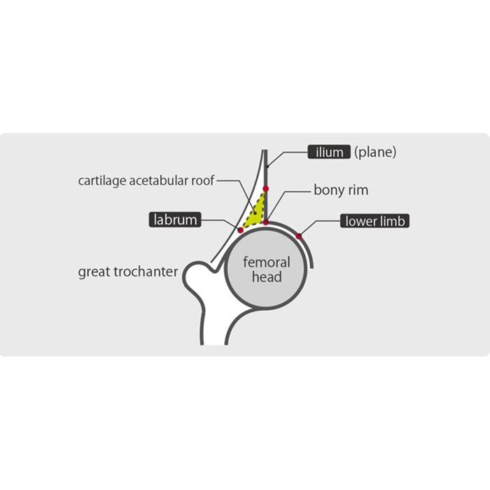 chondro-osseous junction(bony part of femoral neck), femoral head, synovial fold, joint capsule, labrum, hyaline cartilage preformed acetabular roof, body part of acetabular roof, body rim(check list 1), lowe limb of os ilium, correct plane, labrum(check list 2)