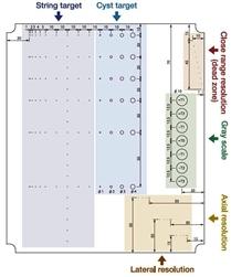 Useful both for daily assessment and further research. Gray scale for contrast evaluation, cyst targets with non-resonance cylinders, line targets for geometrical evaluation, close range (dead zone) resolution, axial and angular resolution are prepared for scanning. The phantom is designed to allow scanning from all four side walls.