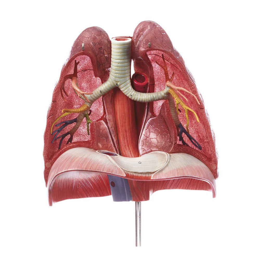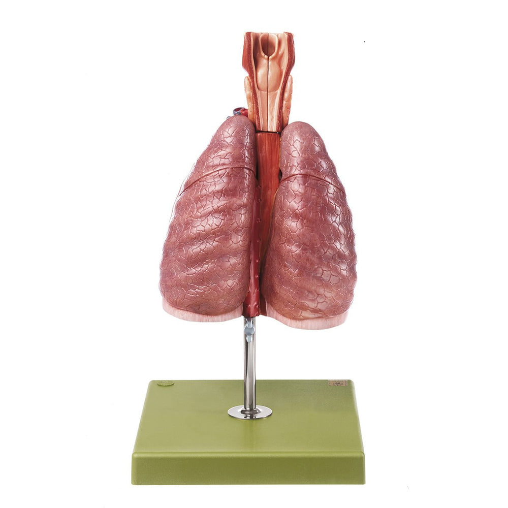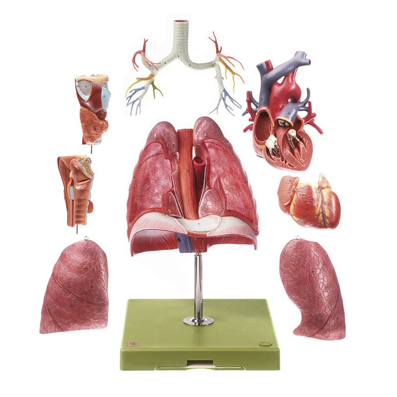 Natural Size, in SOMSO-Plast®. Separates into 8 parts: lungs (2), heart (2), larynx (2), bronchial tree. On a stand with green base.Dimensions and Weight: