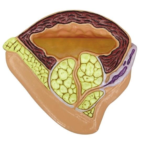 Near full size, mid-sagittal section showing the anatomy of the pelvis and prostate. Includes both normal and benign prostatic hyperplasia (BPH) inserts. BPH insert shows increased size of prostate, urethral obstruction, urine retention, and thickening and distention of bladder.