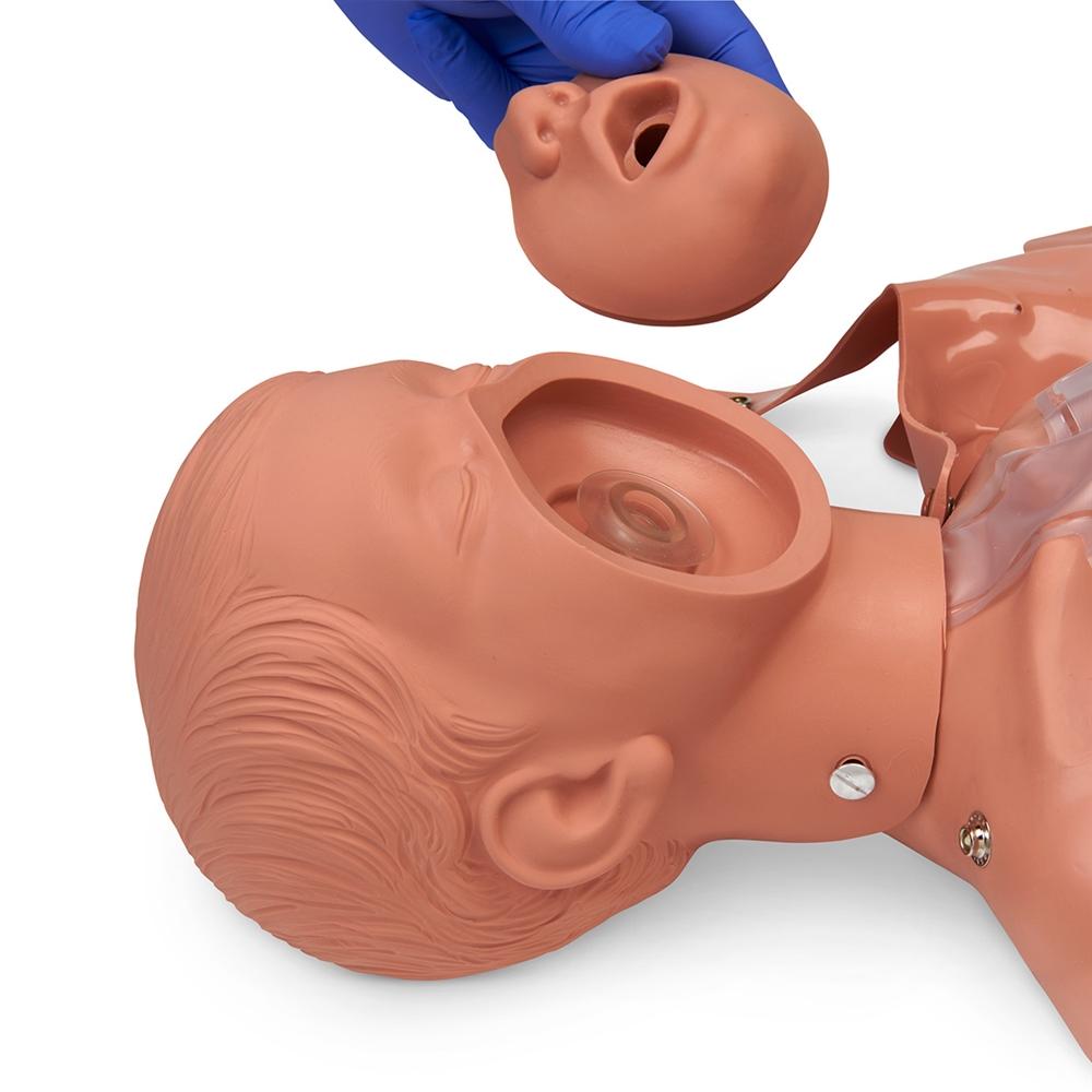 The manikins include a removable mouth/nosepiece, so each student has their own that can be decontaminated for reuse. The non-rebreathing airway systems are replaced at the end of every training day. Manikins offered "with electronics" indicate with a light signal correct hand position and adequate depth of compression and ventilation.