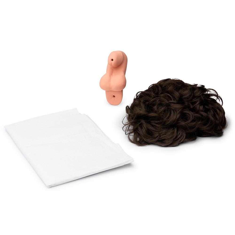 Patient-sensitive bathing techniques and general hygiene procedures are facilitated by the manikin’s accurate, interchangeable male/female genitalia and smooth, washable surface. A removable wig permits shampooing.