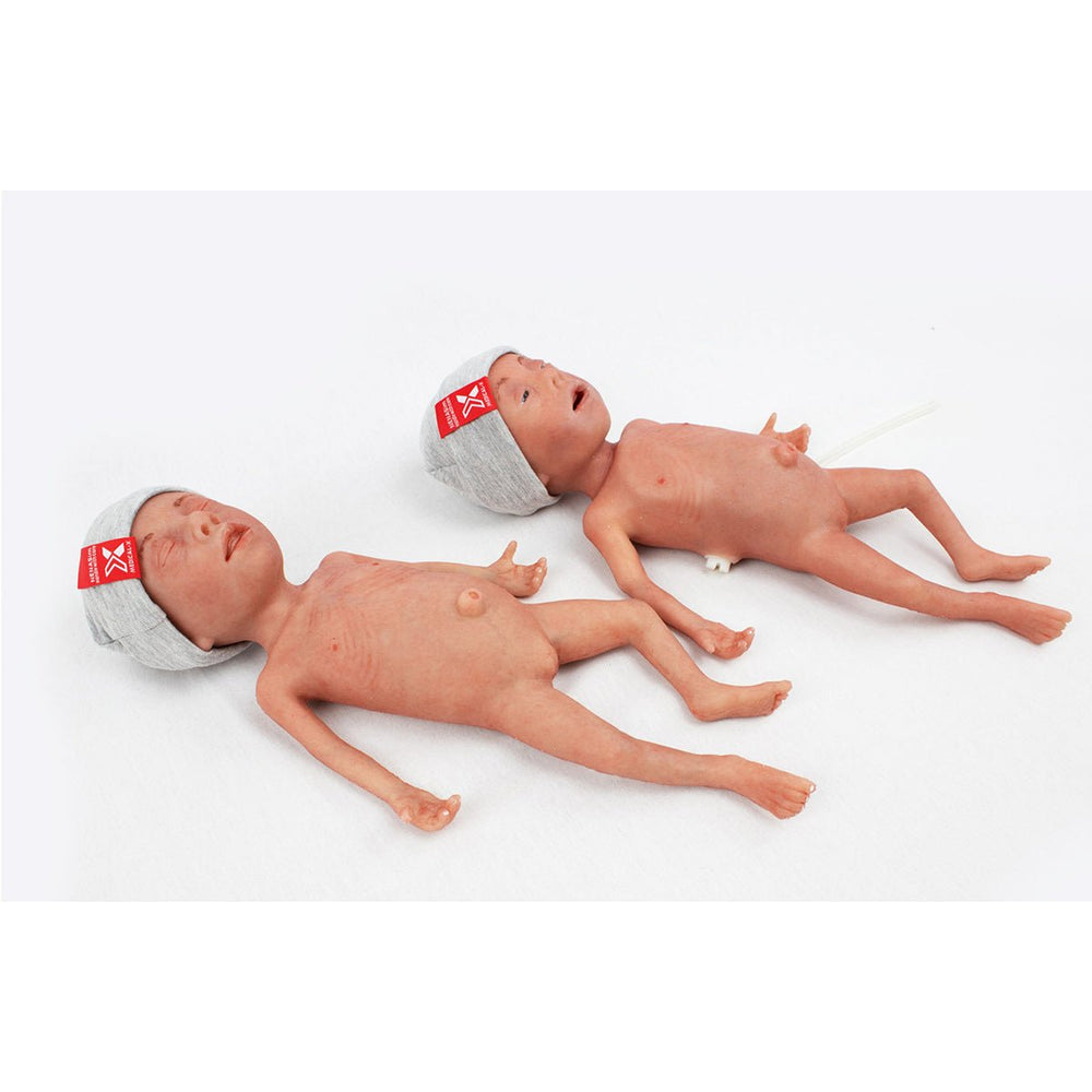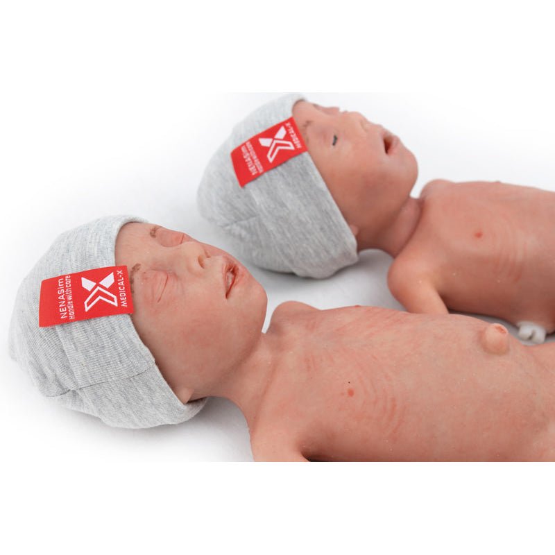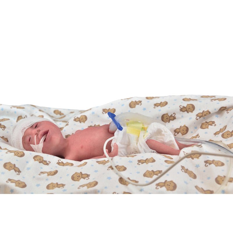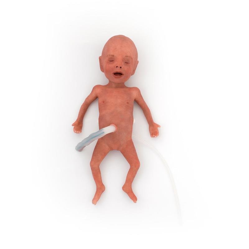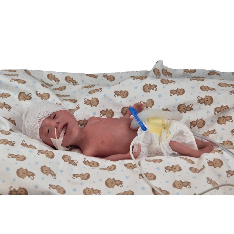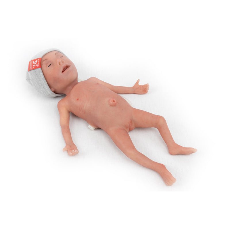 The NENASim Preemie is a realistic interactive simulator, to be used for neonatal intensive care training. The Preemie allows for a variety of medical procedures, preparing medical staff and everyone involved in the enormous responsibility of caring for a preterm baby. The main assets of the Preemie are its realistic airway, lifelike feel and looks, and task-training functionalities. NENASim Preemie represents a female baby with 12.99 inches and 1.61 lbs. NENASim Preemie is available in two degrees of fidelity.