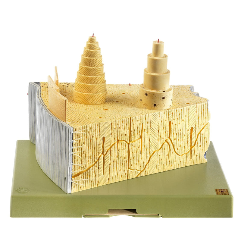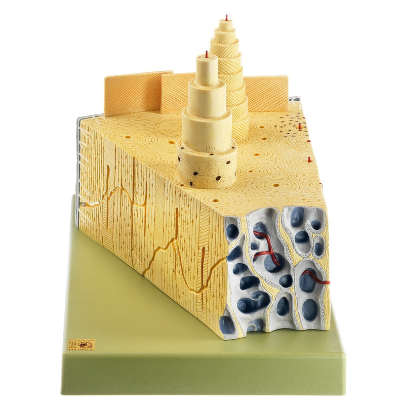 The SOMSO Construction of Bone Model shows Haversian lamellae, outer bone- and interstitial lamellae etx. Model in one piece. On a green base.