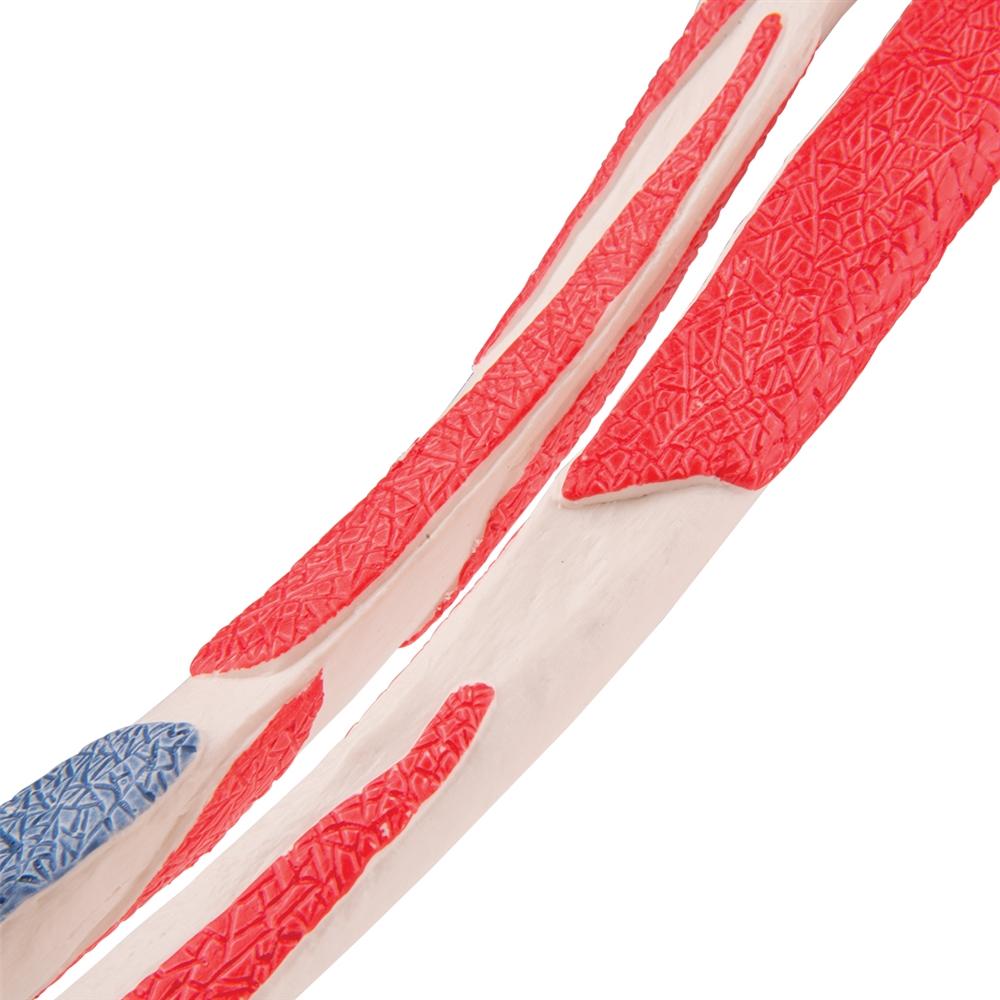 This elbow joint model shows the right elbow of a male with individual muscles and the muscular origins and insertions on humerus, radius and ulna. The muscles can be attached to and removed from the corresponding areas of origin and insertion on this elbow joint for easy and fast demonstration. For didactic reasons, the areas of the muscular origins and insertions are raised and color-coded.