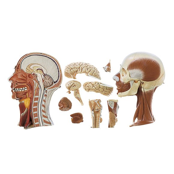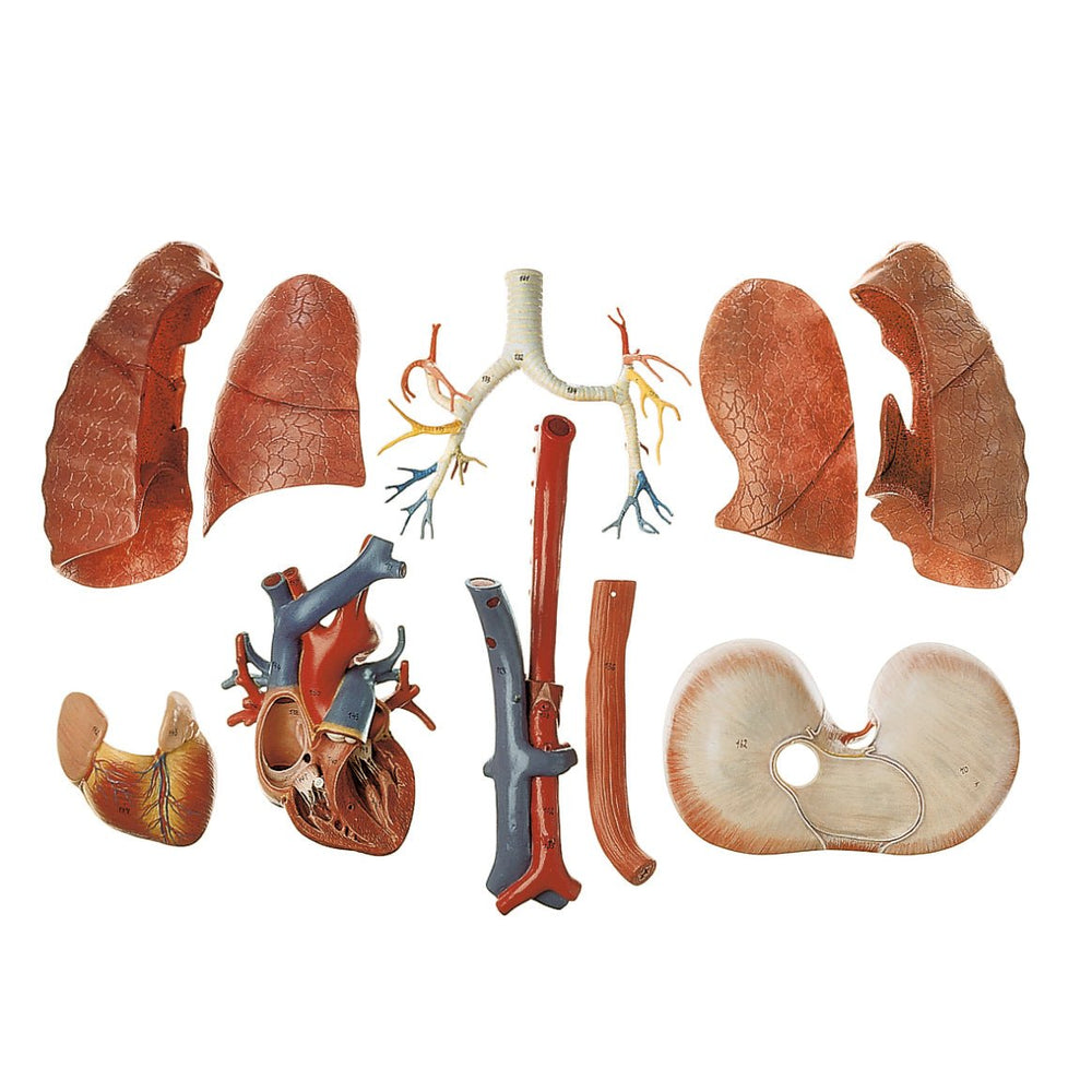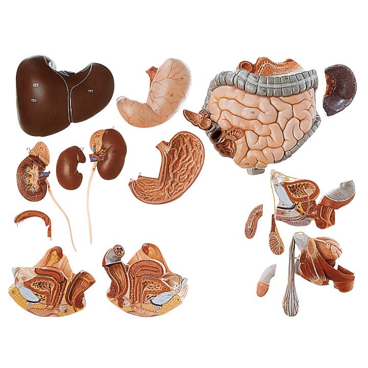 natural size, made in SOMSO-Plast®. Model separates into 41 parts as follows: head removable at the height of the costal arch and altogether detachable into 10 parts, thoracic and abdominal cover (2), left shoulder joint, female mammary gland, right lung (2), left lung (2), heart (2), bronchial tree, diaphragm, esophagus, liver, stomach (2), small and large intestine with duodenum and pancreas, opening appendix, spleen, descending aorta with inferior vena cava, right kidney and left kidney with ureter (3), female genitalia (3), male genital organs (4), torso. On a green base. Height: 90 cm. (torso 86 cm.), width: 40 cm., depth: 26 cm., weight: 15.5 kg.Cleaning and disinfecting your SOMSO Model: