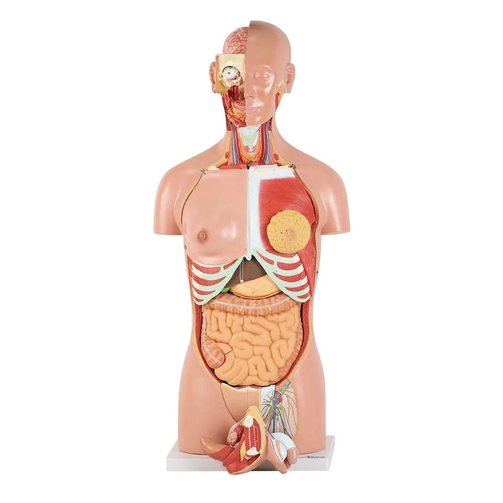 Full life-size with open back, composed of 28 parts, provides realistic reproduction and detailed anatomical structures. All body systems are represented with full accessibility. Significant structures are numbered and referenced in an explanatory leaflet. This model is a valuable addition to any biology or anatomy course.