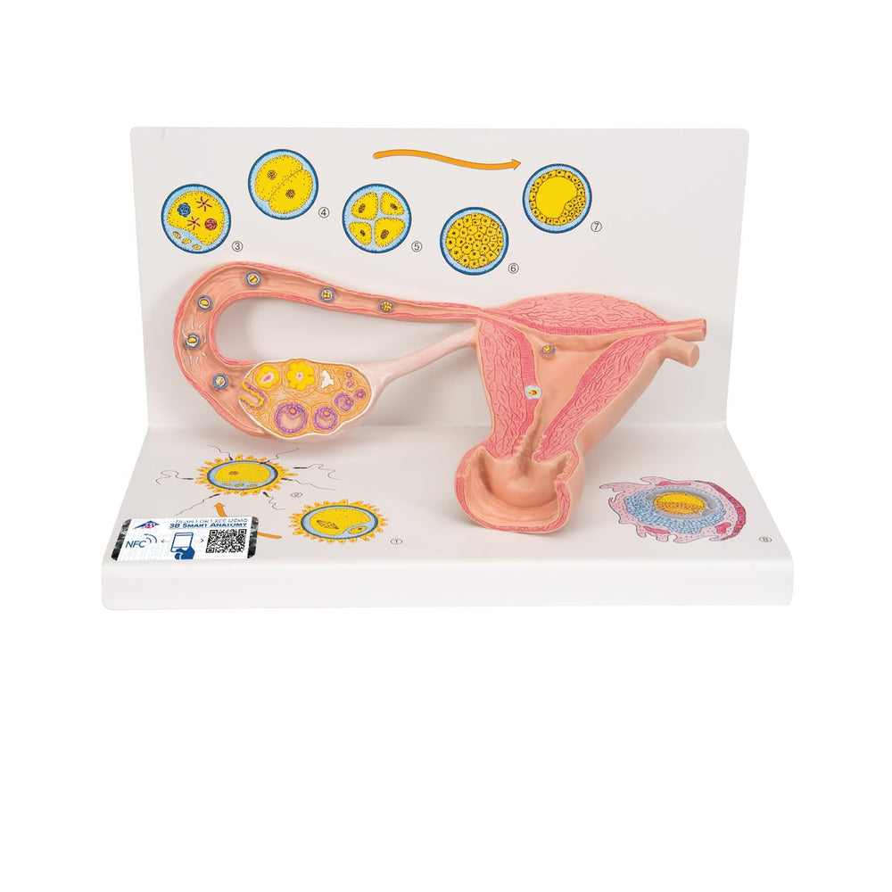 Stages of Fertilization and the Development of the Embryo, 2-times magnified, Item Details: The model illustrates schematically how the ovum matures, how ovulation and fertilization occur and how the fertilised ovum develops to the stage where it embeds itself in the womb wall to begin the growth into an embryo. The various stages are shown in larger-than-life model form in an ovary, fallopian tube and womb. An even more enlarged illustration of each is also printed on the base. Supplied on a base.