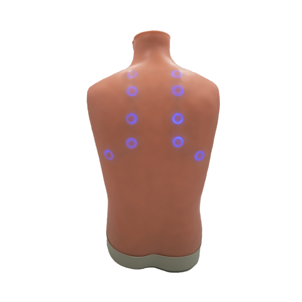 Using the SmartScope 2.0, lung sounds can be detected at eleven anterior, ten posterior, and two midaxillary locations. Learners can practice auscultation at five anterior heart sites and five bowel sites.