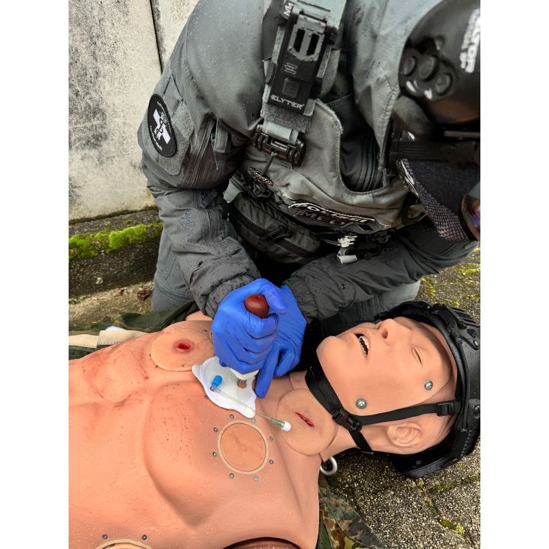 For this reason, great importance is attached to self-help and helping others. This enables them to provide first aid under tactical conditions. Simple haemostatic measures for gunshot wounds are carried out using self-adhesive and extremely realistic wound dressings and can be treated using a tourniquet, increasing the wounded person's chances of survival. Applying a tourniquet to the extremities prevents excessive blood loss and the resulting death from bleeding to death. Ideal for training with the bleeding module which can be controlled via an APP.