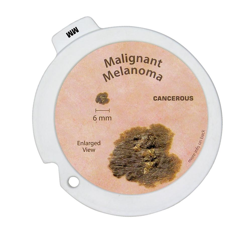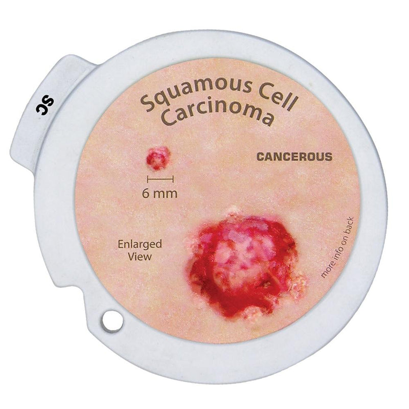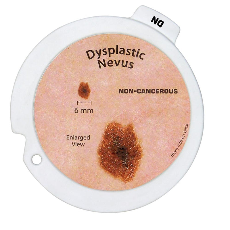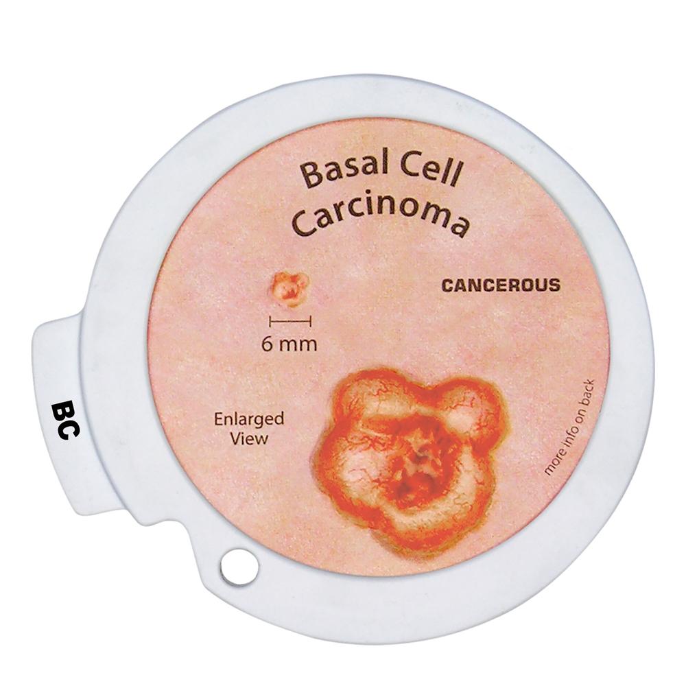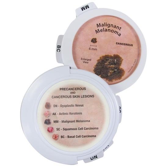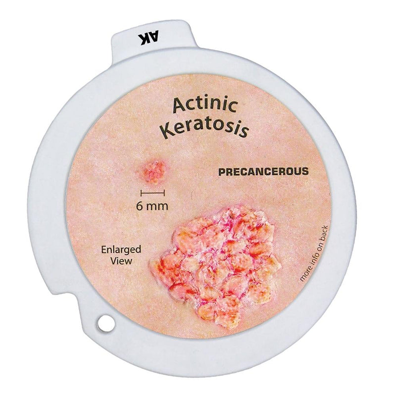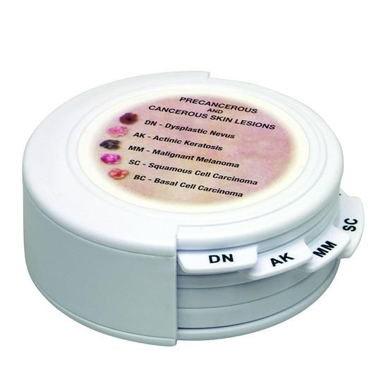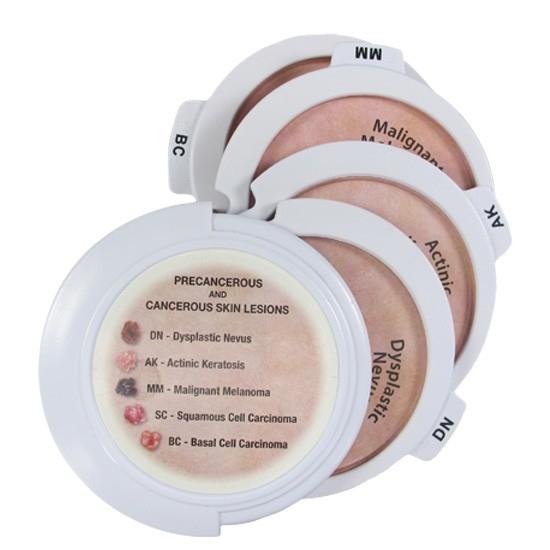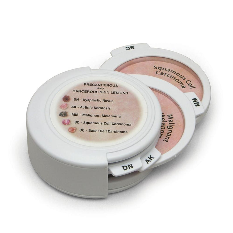 Model presents full size and enlarged views of dysplastic nevus, actinic keratosis, malignant melanoma, squamous cell carcinoma, and basal cell carcinoma skin lesions. Each disk has a 3-dimensional surface to help demonstrate the skin condition. Back side of disk presents additional lesion information.