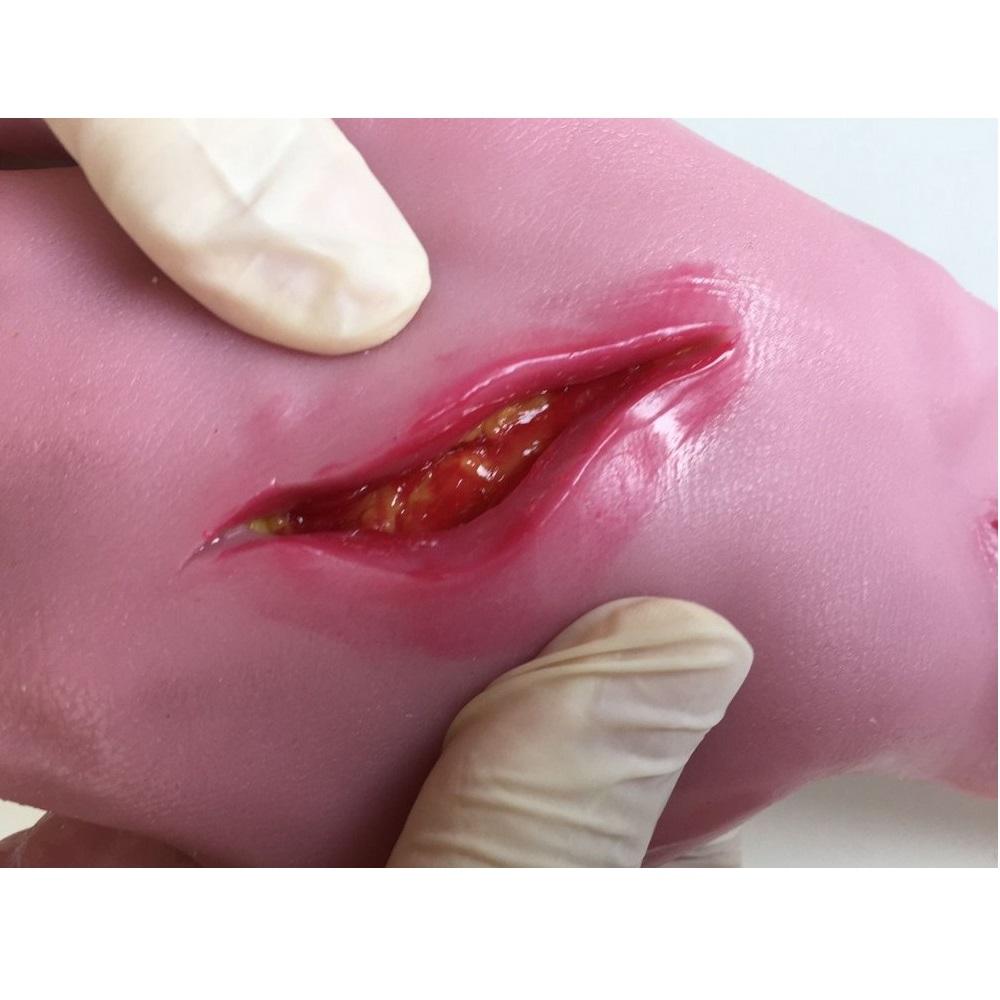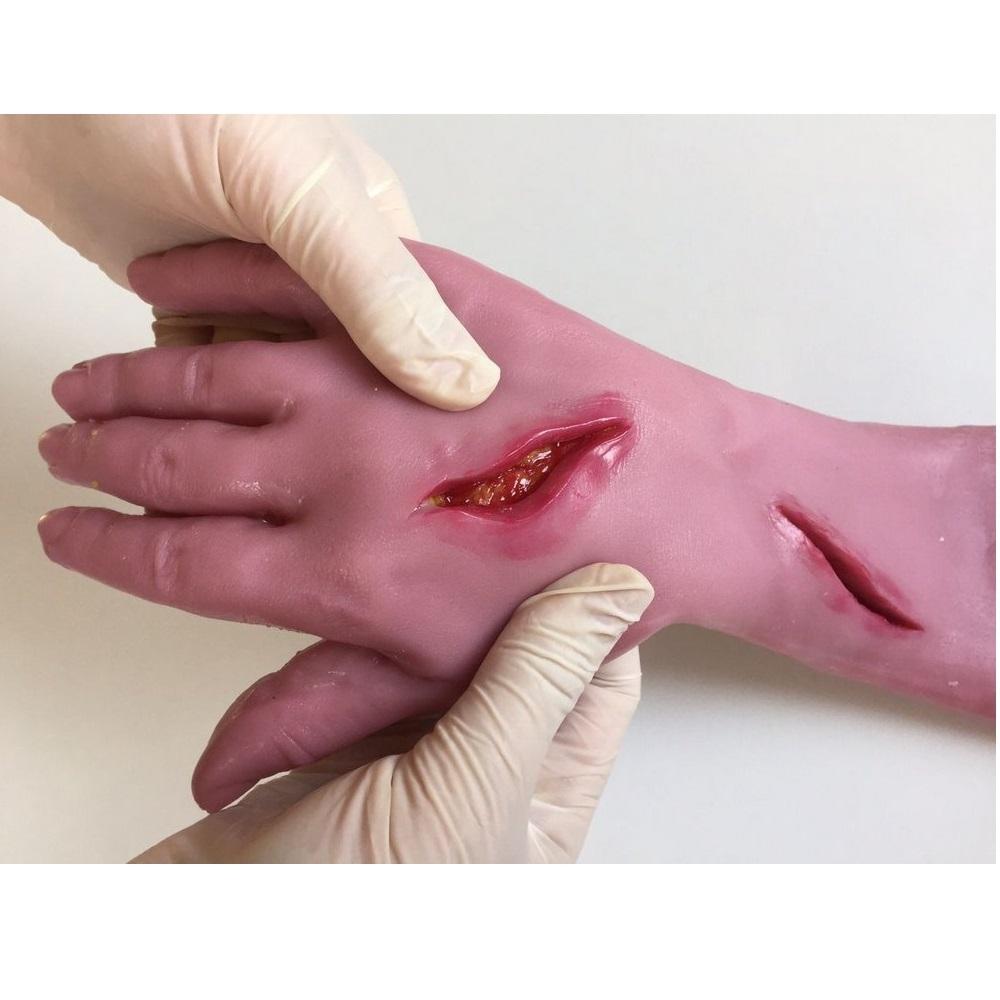 Neoderma has excellent elasticity but does not withstand strong tensions of suture, just like human skin. At the end of the procedure, the nodes must be removed before storing the material for a new use. The Suture Glove should be put on with the help of liquid glycerin and hydrated in the same way after use. Then wrapped in plastic film and stored away from light and heat.