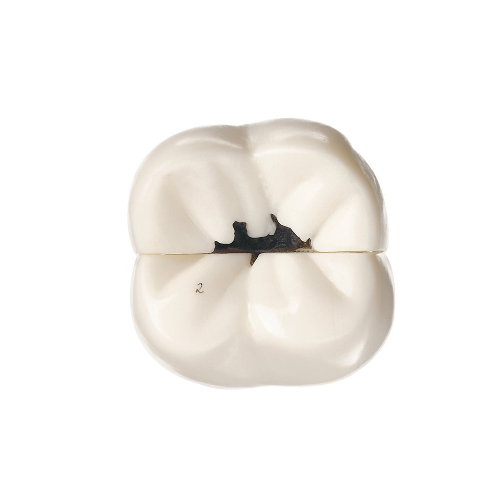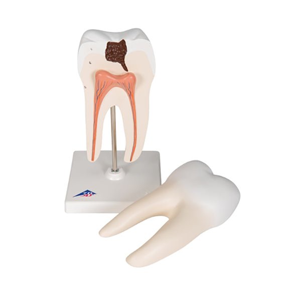 Enlarged approx. 8 times, in SOMSO-Plast®. Separates into 3 parts showing dental caries in initial and advanced stages. On a stand with green base.Cleaning and disinfecting your SOMSO Model:Spray a rapid and effective water based disinfectant for use on surfaces and wipe with a soft cloth.