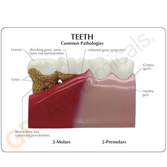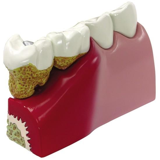 Oversized model of premolars and molars featuring many common dental problems, some of which are: abscess, advanced periodontitis, cavity, crown, decay, filling, gingivitis, plaque, and severe bone loss.