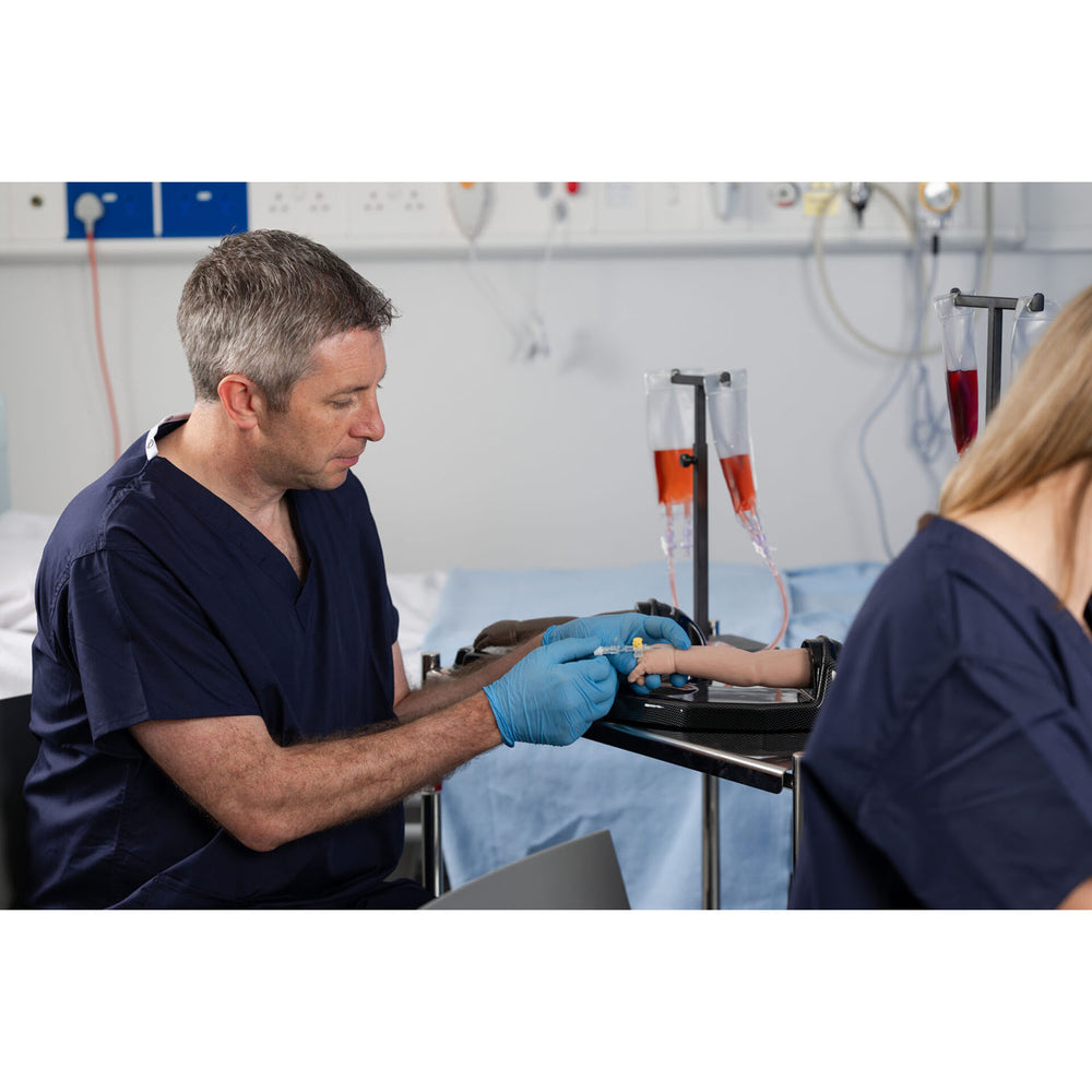 The TruInfant IV Arm provides lifelike resistance during cannulation and delivers blood flashback to reinforce correct vessel entry, needle control, and learner confidence in a controlled training environment.