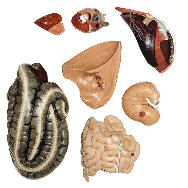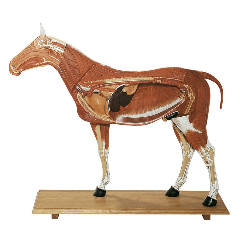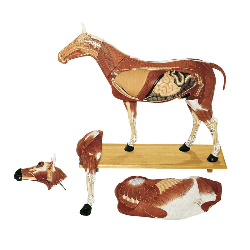 The horse model is detachable into 14 pieces as follows: right side of the body, left side of the body, right side of the head, left side of the head, left foreleg, left abdominal wall, right buttock muscle (exterior), tail, heart (2 parts), lung, diaphragma, small intestine, large intestine, stomach.