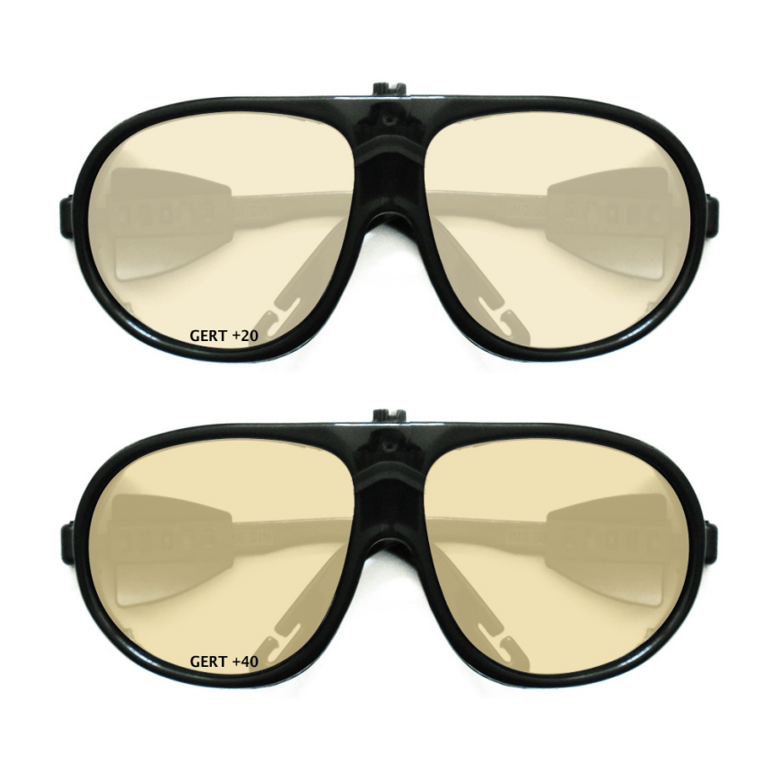 The goggles with the orange-tinted lens shown in some pictures have been discontinued and replaced with two special glasses that simulate visual impairments of approximately 20 and 40 years of age. See manual below for details.