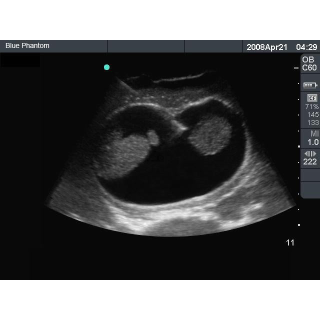 Blue Phantom ultrasound guided amniocentesis training model contains realistic pelvic anatomy including a gravid uterus with a fetus of 18 week gestational age, umbilical cord with both fetal and placental cord insertions, anterior/anterolateral placenta, cervix, a variety of fluid pockets enabling users to begin training utilizing larger fluid pockets and work to develop their skills allowing them to guide needles to smaller pockets of amniotic fluid. At Blue Phantom we expend tremendous effort to match the imaging characteristics of real human tissue allowing you to teach and train under optimal conditions. We know that the best simulation training scenarios are requisite on users experiencing the same procedural realism as performing the procedure on patients. All of our simulation materials match the acoustic characteristics of real human tissue so when you use your ultrasound system on our training models, you experience the same quality you expect from imaging patients in a clinical environment.