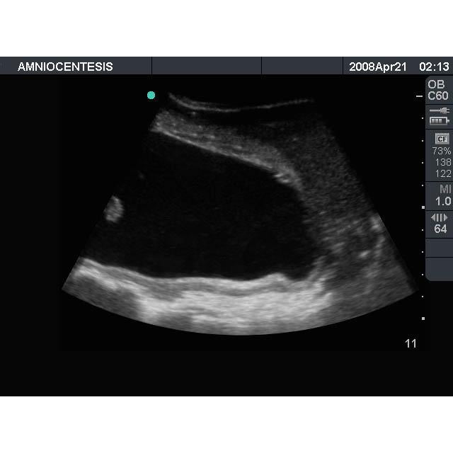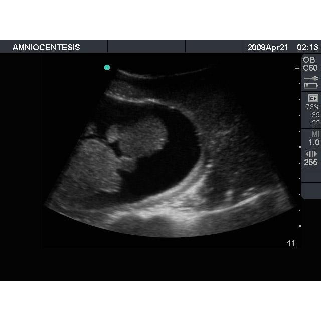 - Ultrasound guided amniocentesis training model contains realistic pelvic anatomy including a gravid uterus with a fetus of 18 week gestational age, umbilical cord with both fetal and placental cord insertions, anterior/anterolateral placenta, cervix, a variety of fluid pockets enabling users to begin training utilizing larger fluid pockets and work to develop their skills allowing them to guide needles to smaller pockets of amniotic fluid