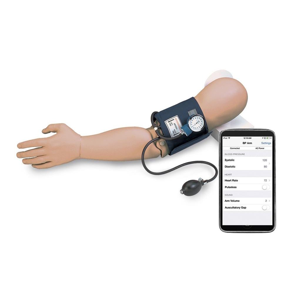 Blood Pressure Simulator w/iPod Technology iPod user interface in a training device for teaching blood pressure skills.This standalone unit incorporates sphygmomanometer placement, palpation of the radial pulse, variable systolic and diastolic pressures from 0-300 mm Hg in two mm increments, variable amplitude of sound heard at the antecubital site, sound jack for group listening, auscultatory gap setting, and heart rate settings. This battery operated trainer can be plugged into 110V AC to save batteries.